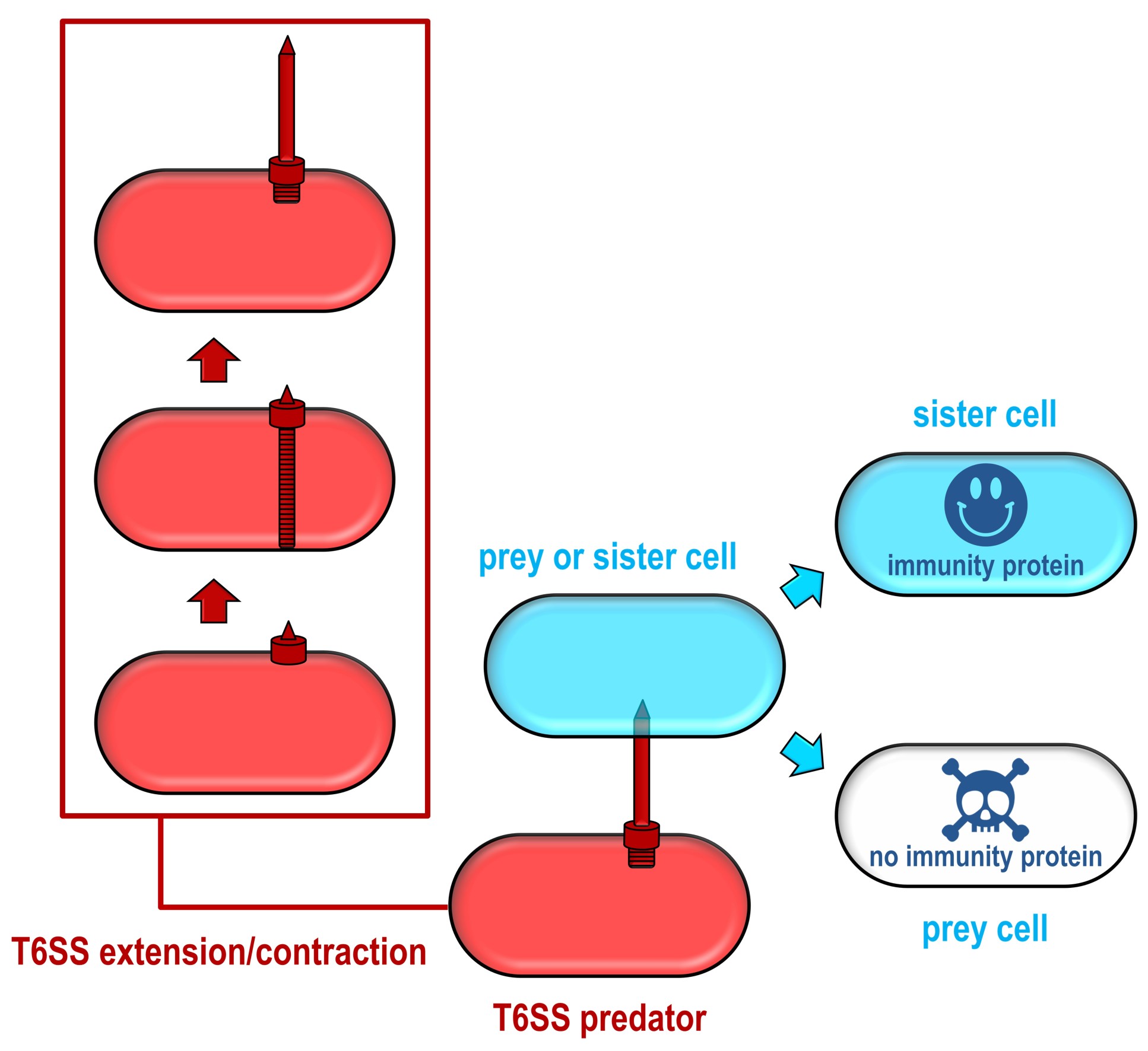 Different species, and even different strains of the same species of bacteria, can compete for resources by launching weapons that impair or kill their competitors. One of these weapons is the ‘Type VI secretion system’ (T6SS), a microscopic harpoon, which several bacteria use to fire toxic arrows at other bacteria.