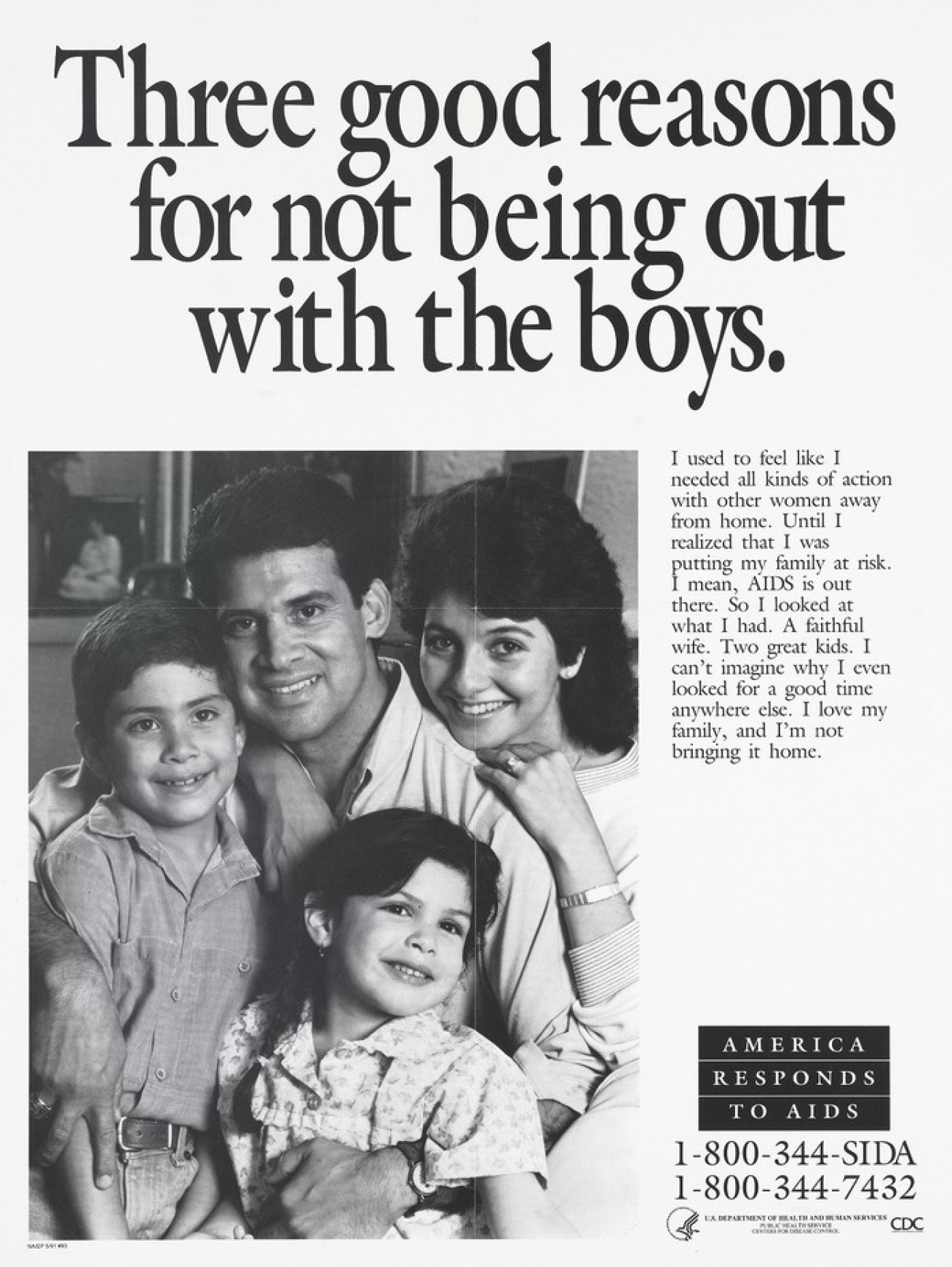 Image credit: A man with his wife and two sons with a message about the importance of being faithful to his wife to avoid putting his family at risk from AIDS; a poster from the America responds to Aids advertising campaign. Lithograph, 1991. Wellcome Collection. In copyright