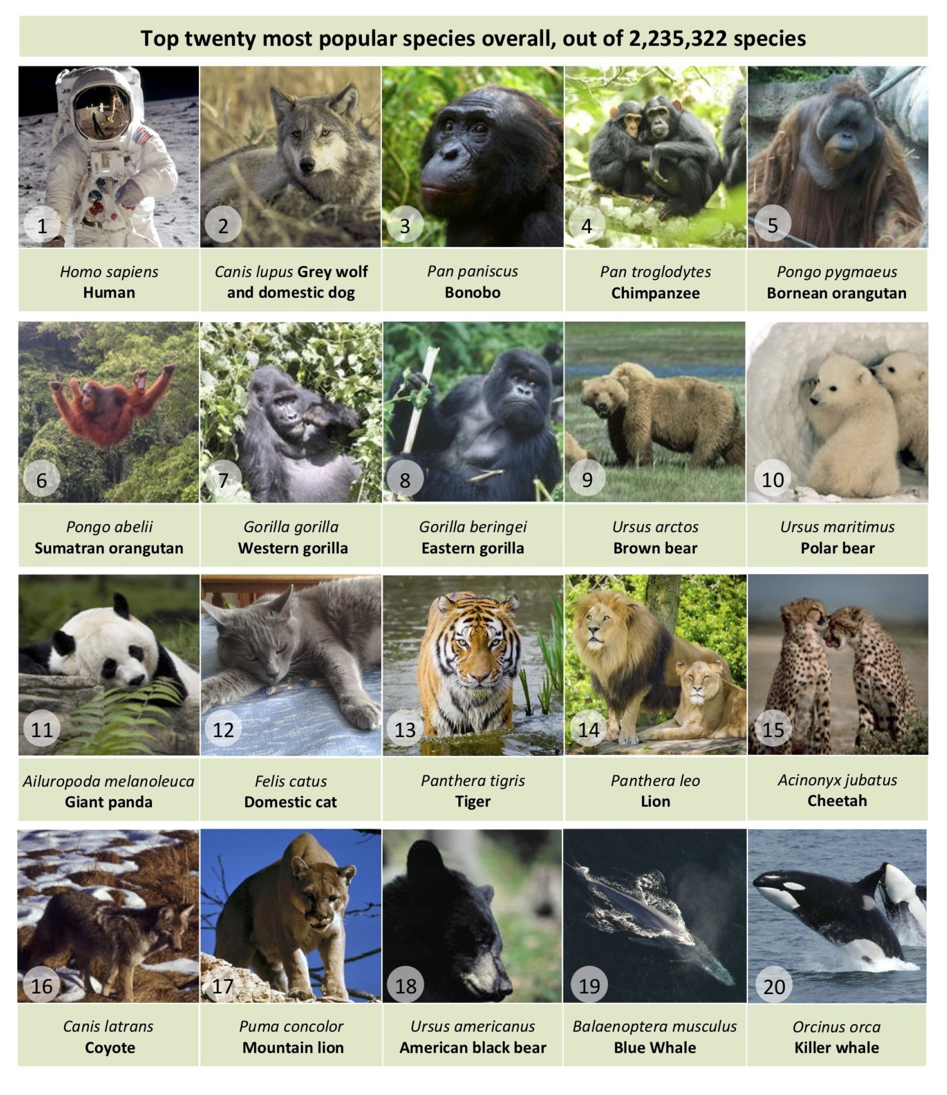The team have also integrated the tree with data from the Wikipedia project to reveal the ‘popularity’ of every species, based on how often their Wikipedia page is viewed. Dr Wong said: “Perhaps unsurprisingly, humans come out on top, but it has swapped places a few times with the second most popular: the grey wolf – the ‘species’ that includes all domestic dogs.”