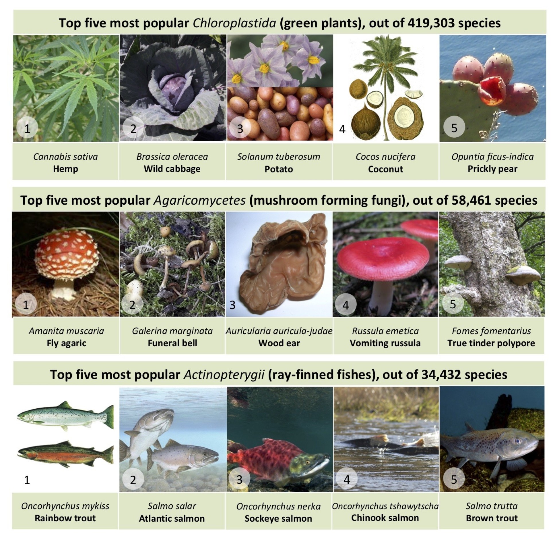 In the plant world, cannabis comes out on top, followed by cabbage, the potato, and the coconut. The most popular ray-finned fishes are sport fishing species, particularly salmon and trout.