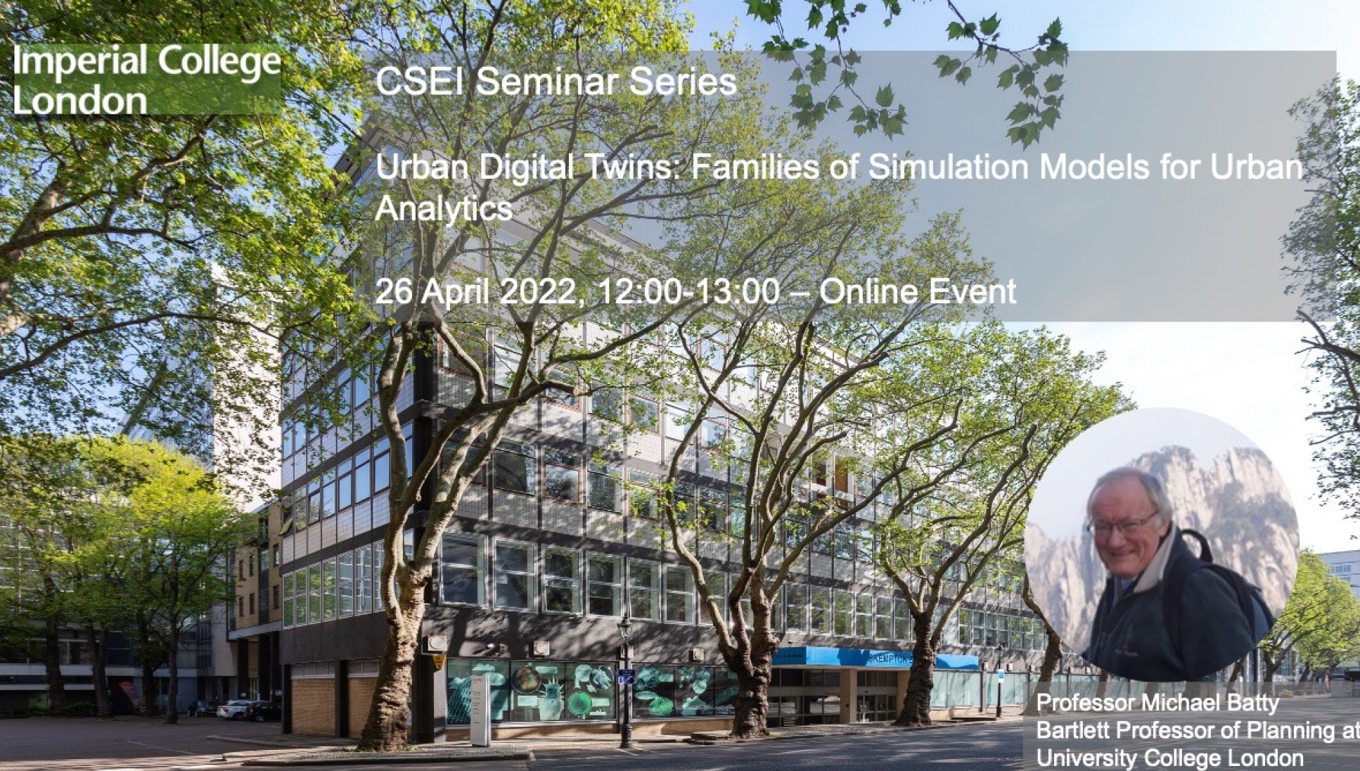 - Professor Michael Batty, Bartlett Professor of Planning at University College London, Chair of the Centre for Advanced Spatial Analysis (CASA) and a Turing Fellow in the Alan Turing Institute, Urban Digital Twins: Families of Simulation Models for Urban Analytics, 26 April 2022 12:00