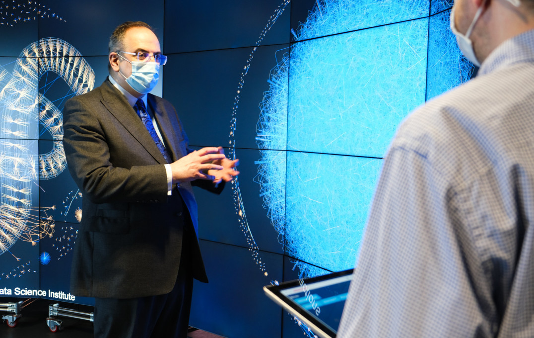 The Minister also visited the Data Science Institute’s Data Observatory. The largest of its kind in Europe, the Data Observatory provides an opportunity for academics and industry to visualise data in a way that uncovers new insights and promotes the communication of complex data sets and analysis in an immersive and multi-dimensional environment.