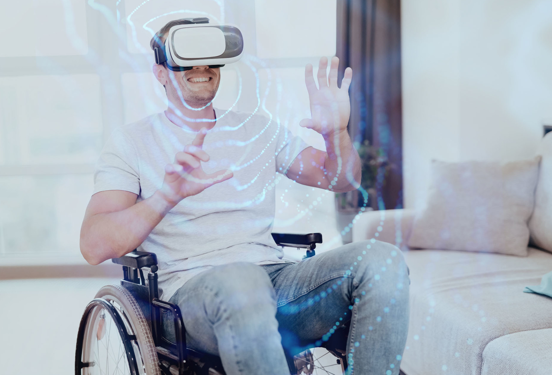 A man in a wheelchair wearing a VR headset performing hand gestures