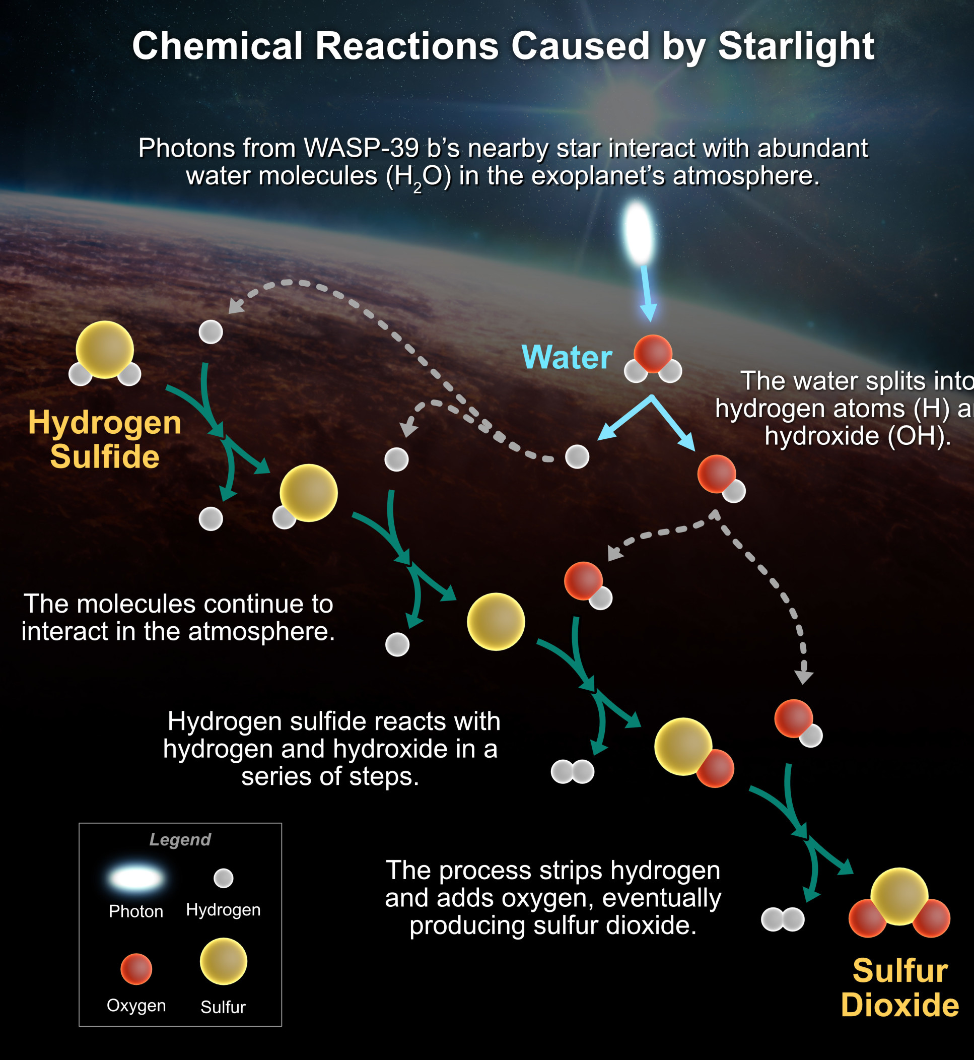 The team discovered that the sulphur dioxide is produced by photochemistry – chemical reactions catalysed by starlight. This is the first time a photochemical by-product has been detected on an exoplanet. Photochemistry is fundamental for life on Earth, from the production of ozone in the upper atmosphere to photosynthesis in plants and algae to the production of Vitamin D in our skin.