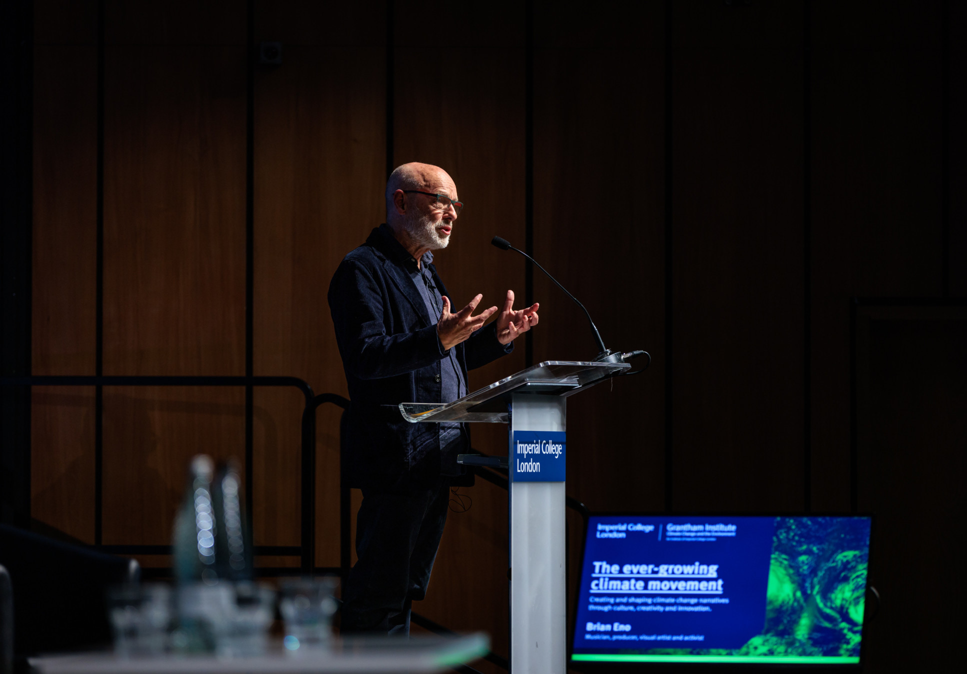 Brian Eno calls for the creative industry to get behind scientists at the Grantham Institute Annual Lecture at Imperial College London.