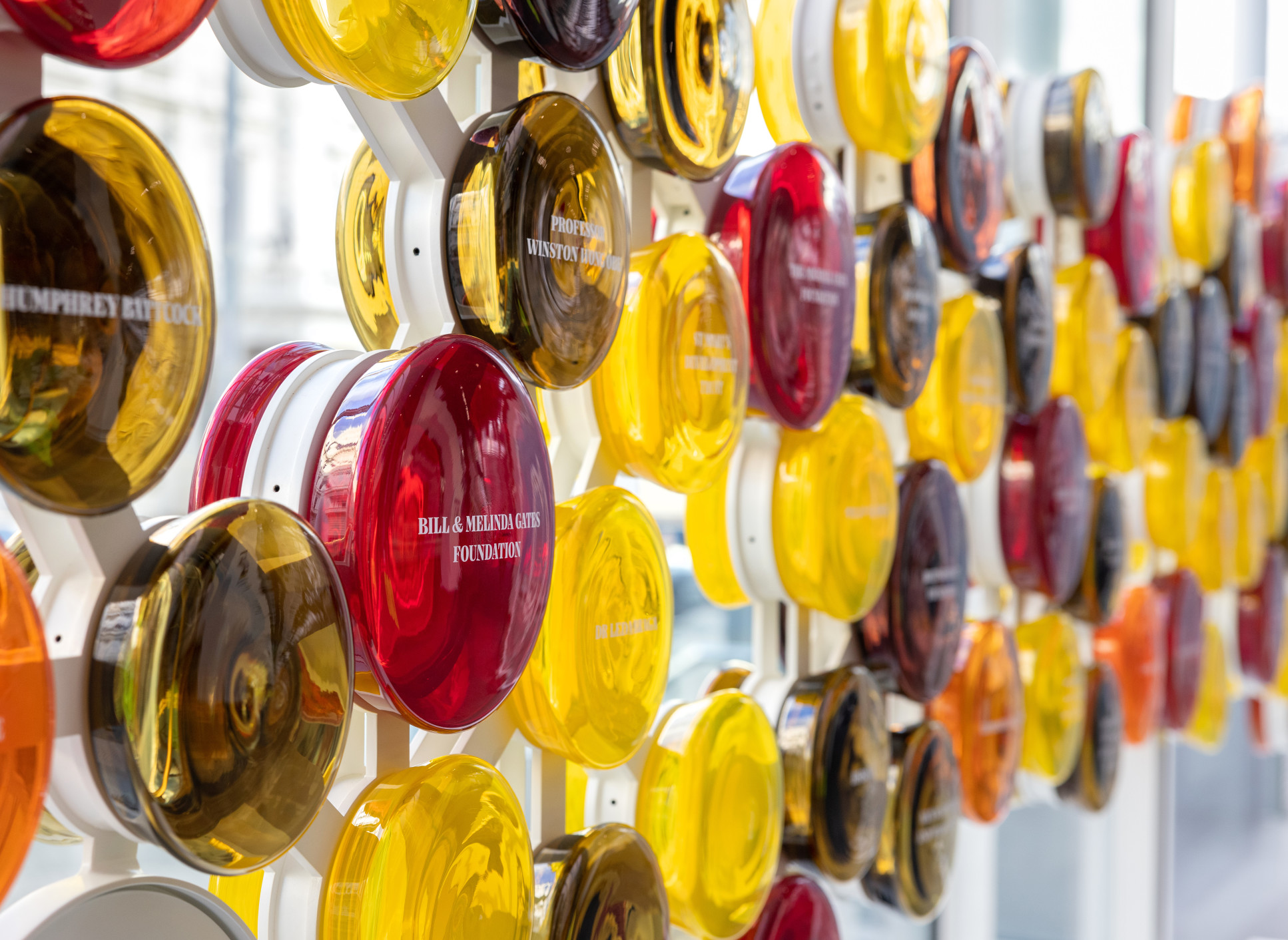 The design comprises roundels of coloured, recycled glass – each bearing the name of a member of the Circle of Benefactors – mounted on a steel framework. The installation was designed by Pentagram, with the glass hand blown by Michael Ruh Studio in London and the steel framework built by Fish Fabrications in Norfolk.