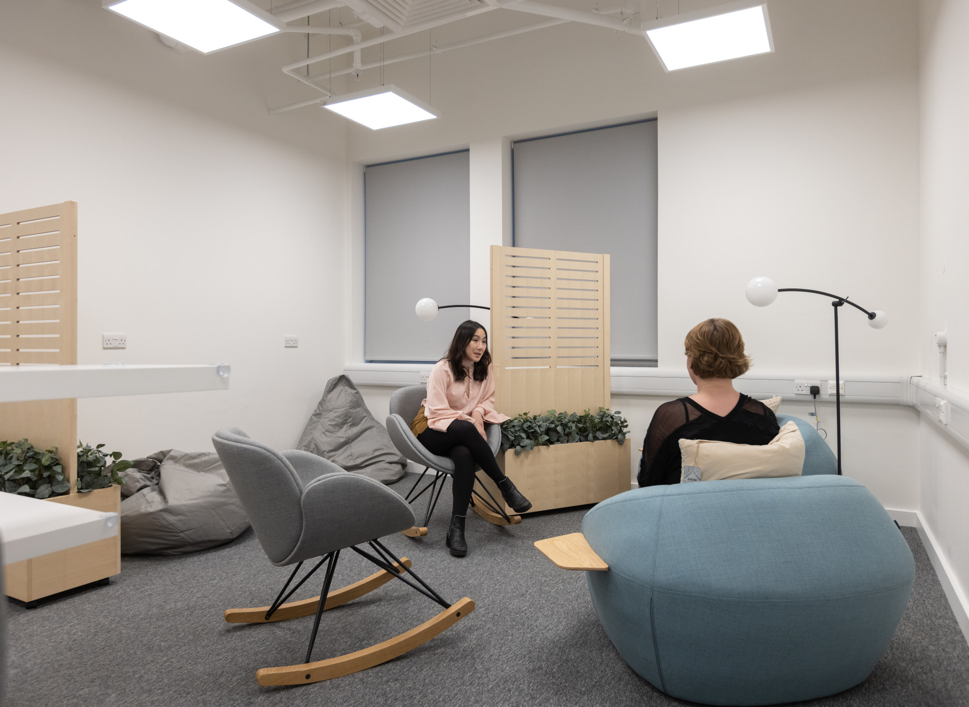 With funds from the President’s Community Fund, £46k was spent renovating the former storage room into a rest area with newly painted walls and ceiling, new carpet and warm white lighting. The room is now furnished with a range of seating options and moveable planters that can be used to zone different areas of the room for more privacy.