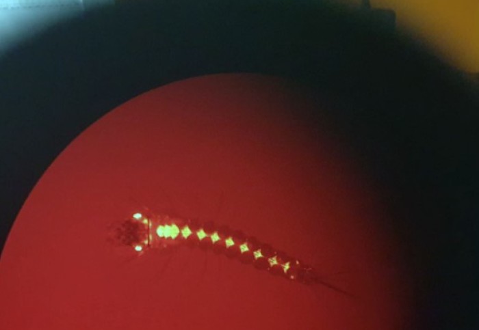 This transgenic mosquito strain was generated and housed in purpose-built, biosafety-level facilities established by Transmission Zero at IHI. It is distinct from wild mosquitoes in that it has white as opposed to dark red eyes, and its nervous tissues are fluorescent.