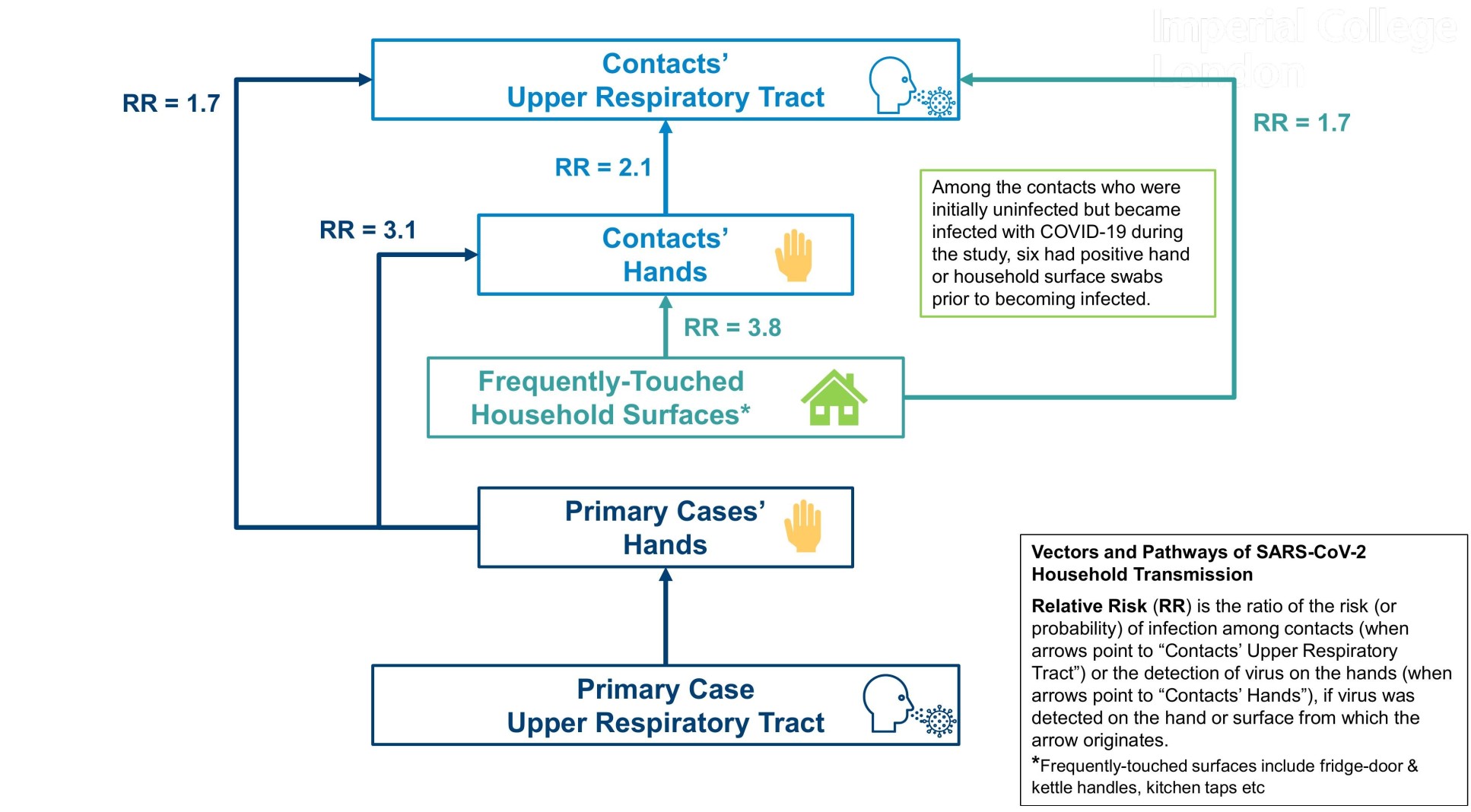 Among the contacts who were initially uninfected but became infected with COVID-19 during the study, six had positive hand or household surface swabs prior to becoming infected. This supports the directionality of transmission being from household surfaces and contacts’ hands to their nose and throat.