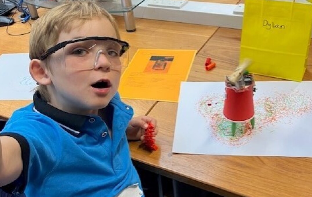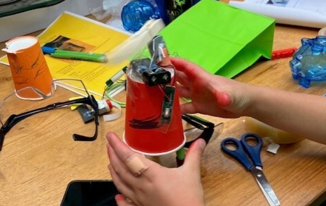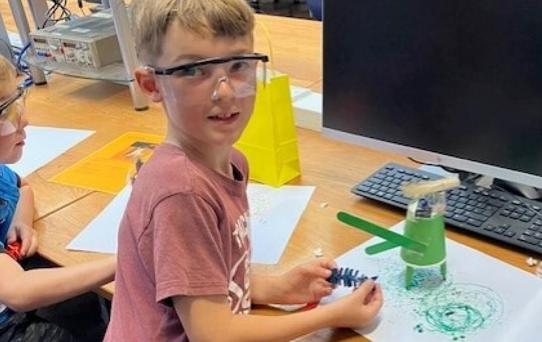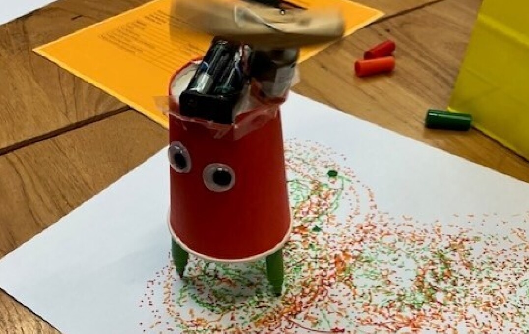 Our electronics lab technicians May and Vic were on hand to help the children build a circuit using a DC motor, wires, and a battery, then attach it to a paper cup, slightly off balanced, to make a simple robot that jiggles around. With marker pens for legs, you can set these characters running on a piece of paper and they’ll create their own unique abstract art for you.