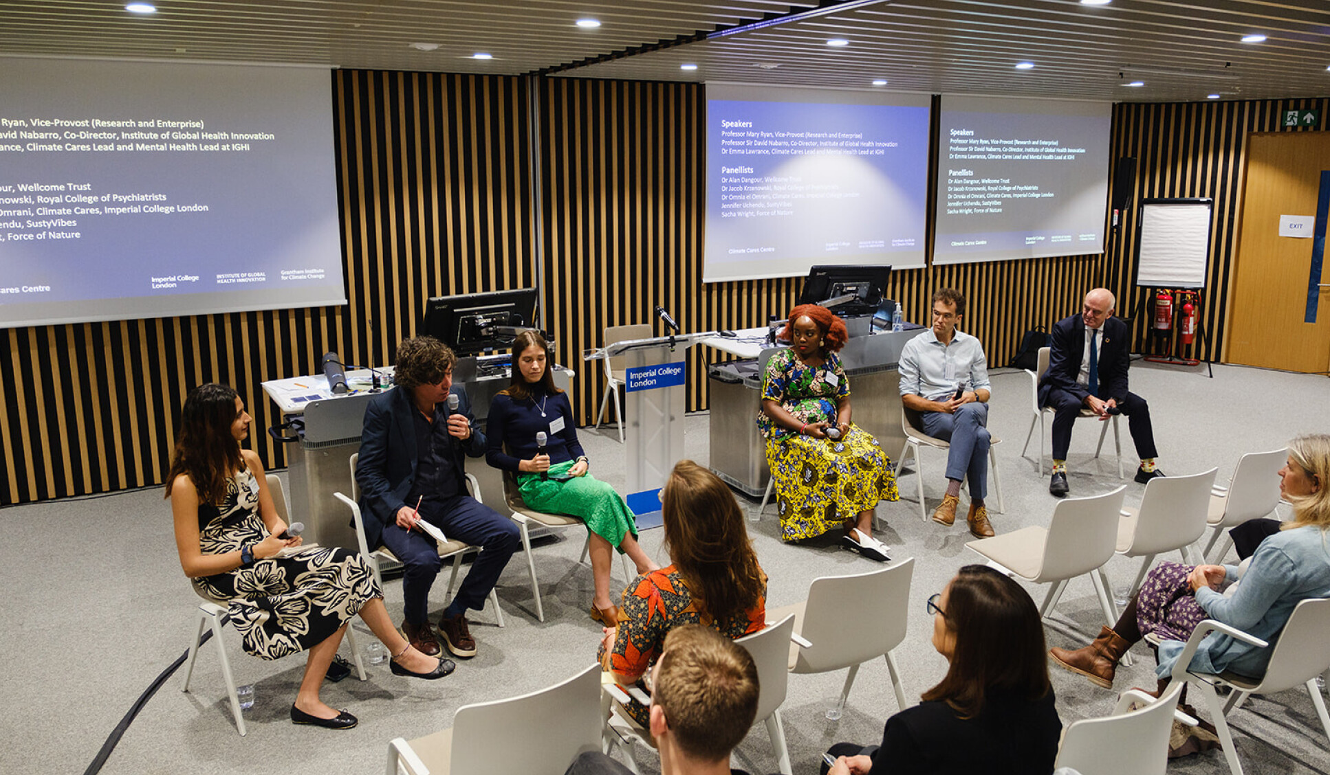 Panellists (L-R): Dr Omnia el Omrani, Climate Cares, Imperial College London; Dr Alan Dangour, Director of Climate and Health, Wellcome Trust; Sacha Wright, Force of Nature; Jennifer Uchendu, SustyVibes; Dr Jacob Krzanowski, Associate Registrar for Sustainability at the Royal College of Psychiatrists; Professor Sir David Nabarro