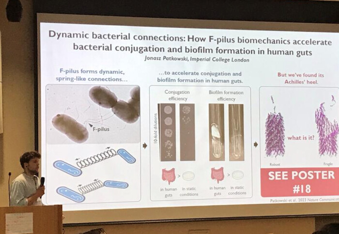 Jonasz Patkowski, a third-year PhD student from the Tiago Costa Laboratory at CBRB, presented his poster titled ‘Dynamic bacterial connections: How F-pilus biomechanics accelerate bacterial conjugation and biofilm formation in human guts’ at the 2023 Gordon Research Conference and Seminar Microbial Adhesion and Signal Transduction in Newport, Rhode Island. His poster about bacterial conjugation – the main driver of the spread of antibiotic resistance in humans – documents how the precise structural properties of the conjugative F-pilus, such as high elasticity, robustness, and presence of phospholipids in its atomic structure, accelerate the rates at which conjugation and biofilm formation occur in turbulent environments, such as in the human guts.