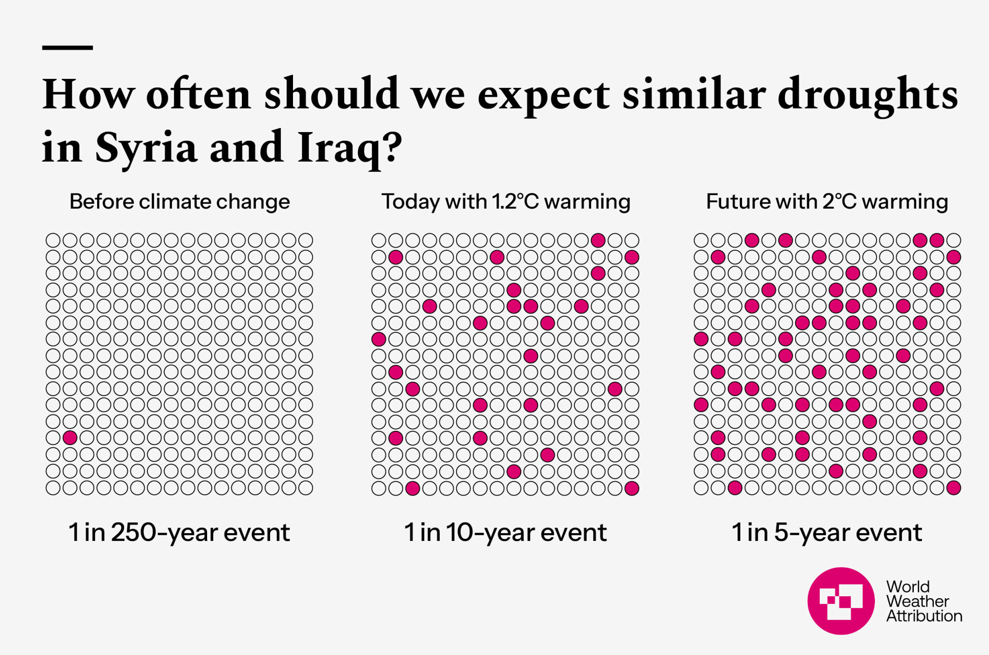 In today’s climate, with 1.2°C of warming, severe three-year droughts in Syria, Iraq and Iran are no longer rare events – the study found that they can be expected to occur at least once every decade in Syria and Iraq and twice every decade in Iran.