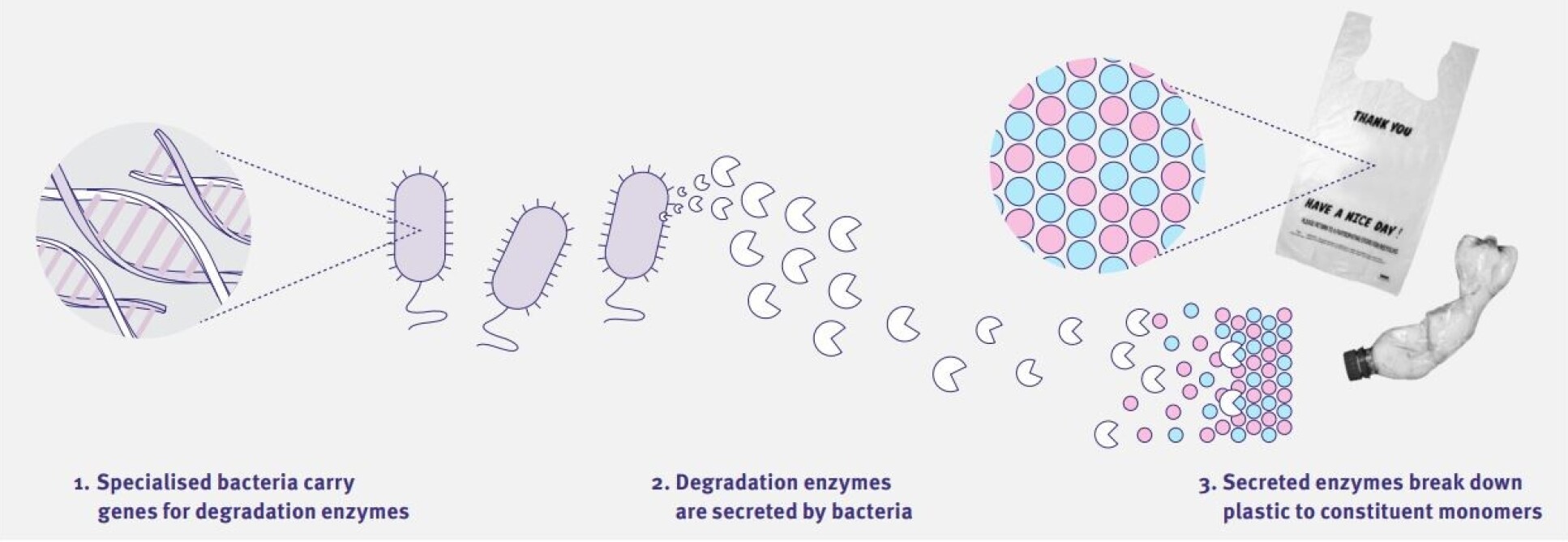 Since other microbes are already present in wastewater plants to produce compost and biogas, the idea would be to use existing infrastructure and incorporate plastic-breaking microbes. Proven to work in the laboratory, research is now shifting towards optimizing the microbes’ survival under the conditions present at a wastewater plant, as well as scaling up enzyme production.