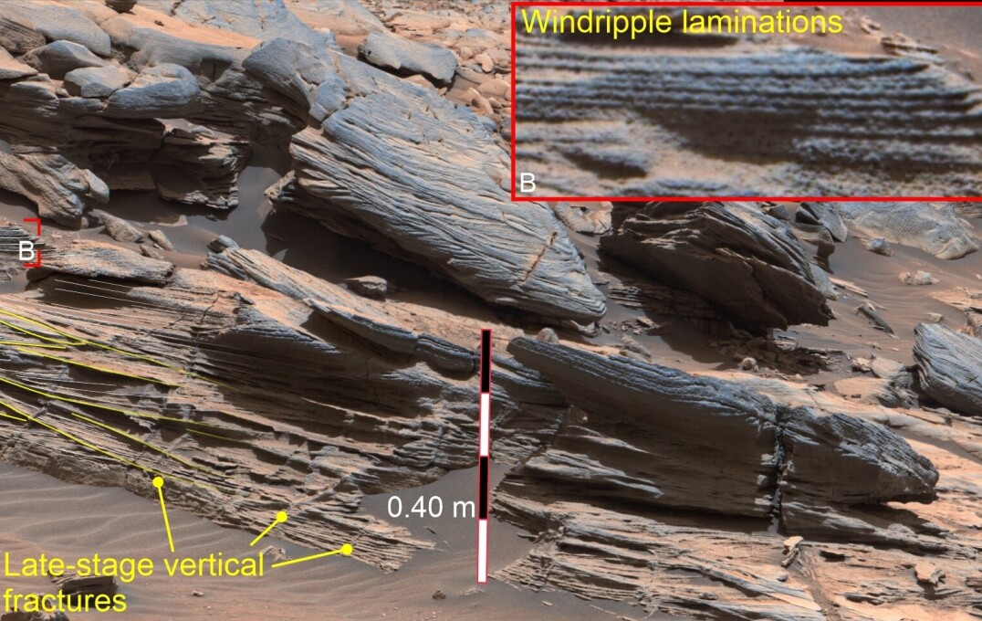 Martian rock composed of ancient dune deposits and wind ripples (NASA/JPL-Caltech/MSSS)
