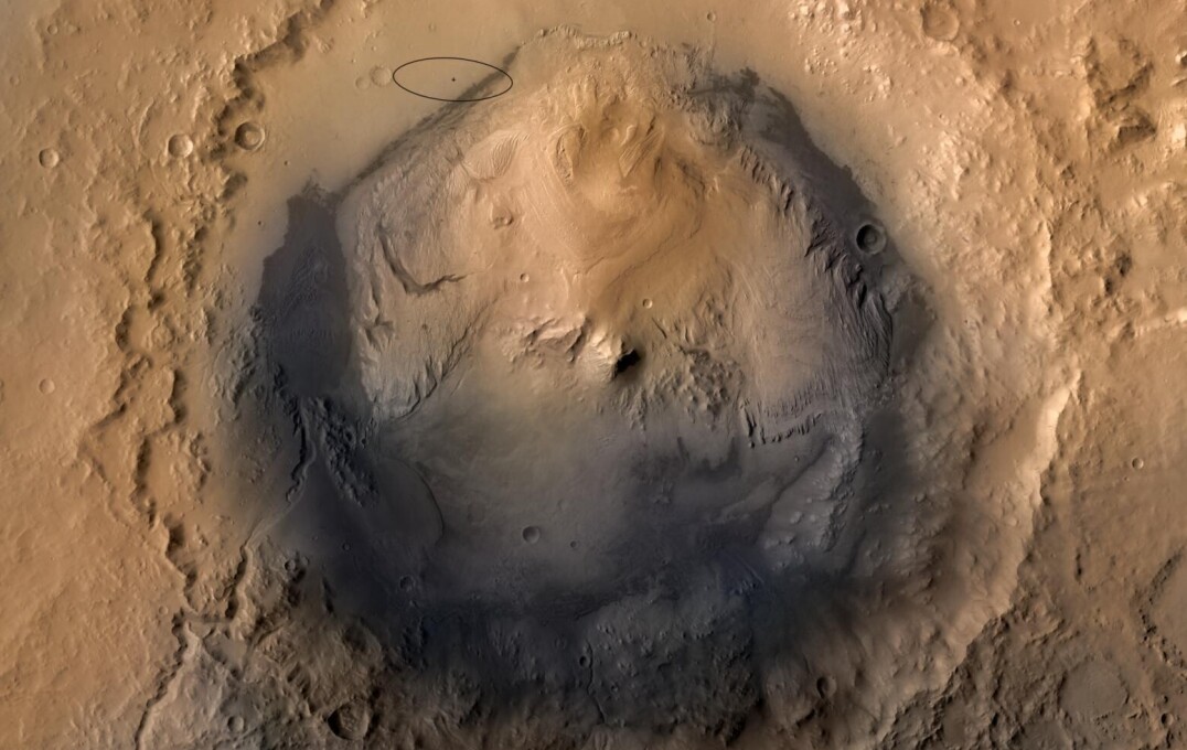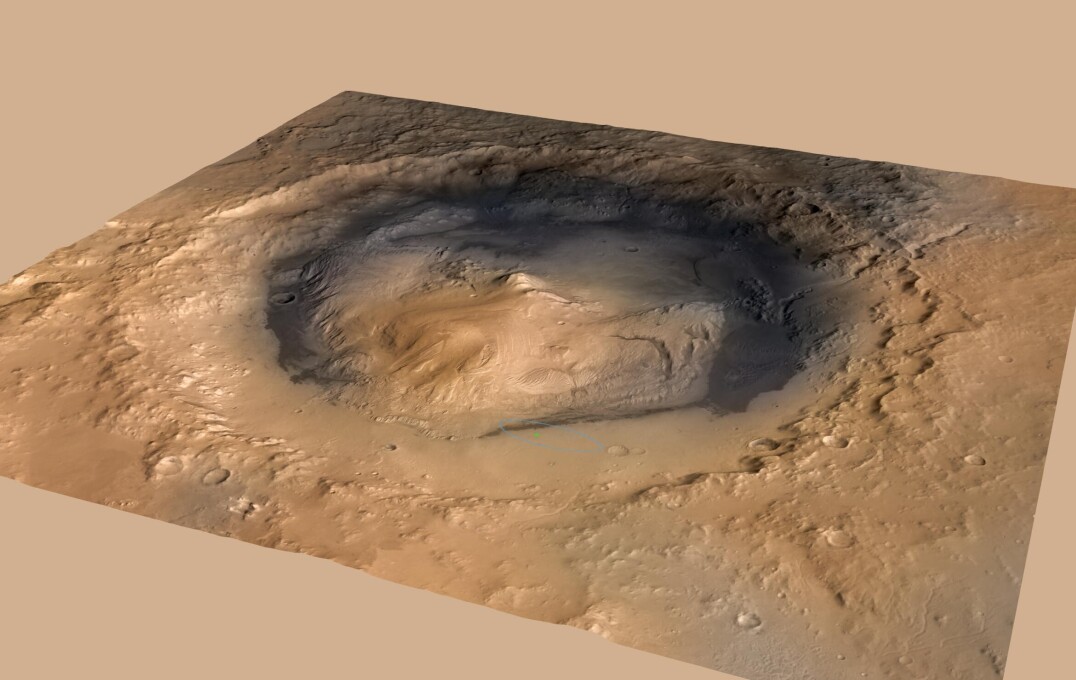 • Birdseye view of Gale crater. Mount Sharp can be seen in the centre, and Curiosity's landing site circled in the top left.