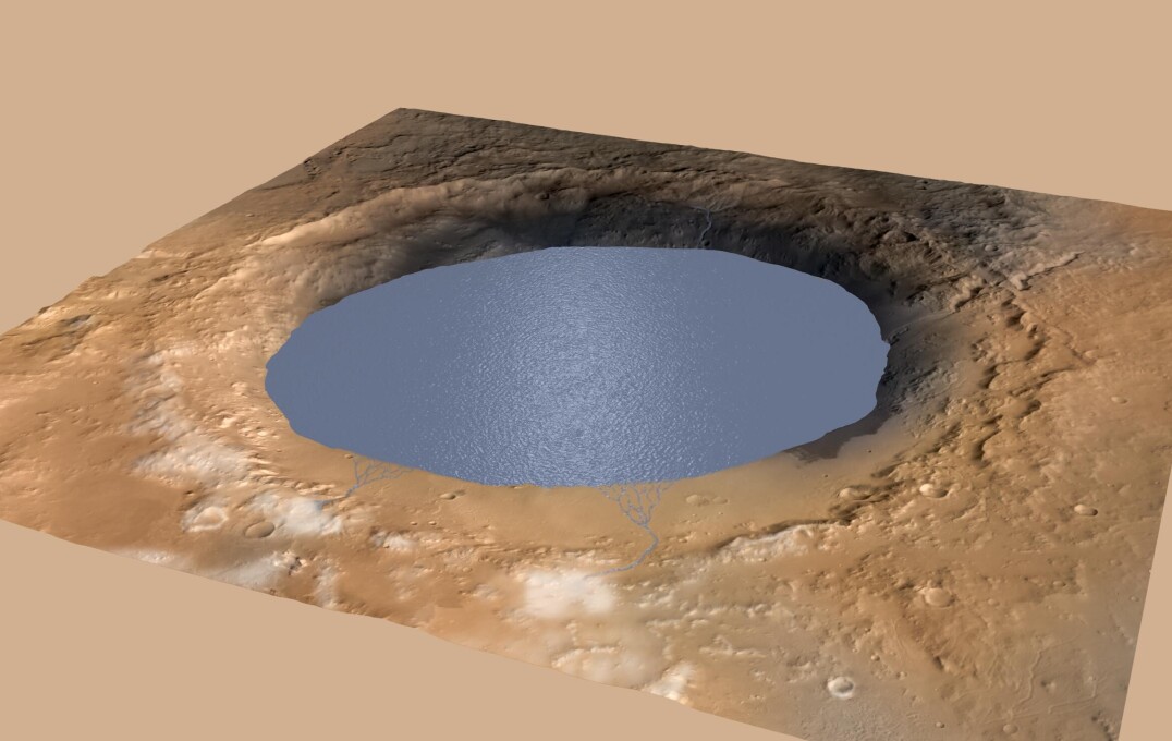 • Image of Mars' Gale crater filled with water, resembling a lake