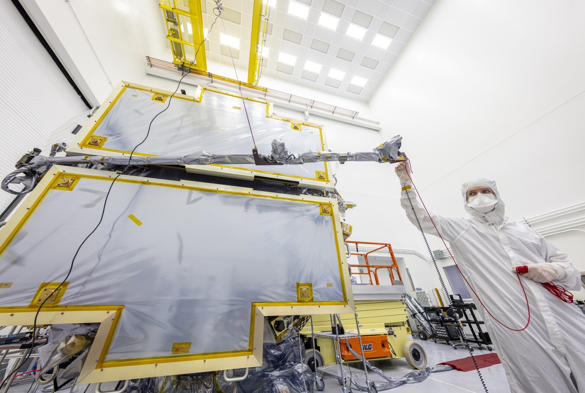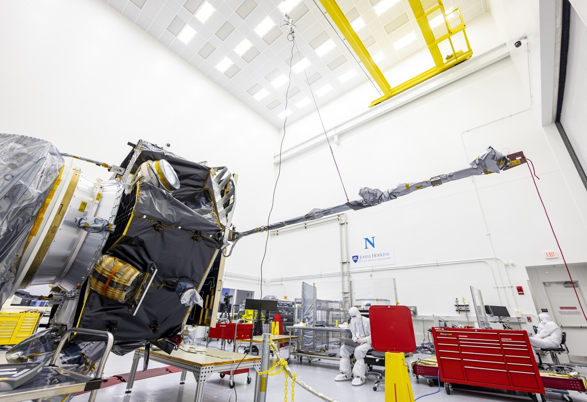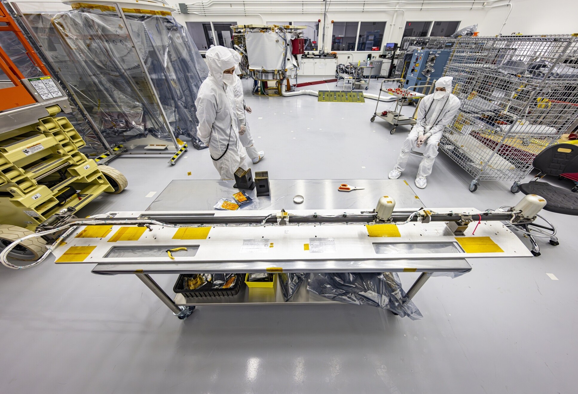 “We also tested the boom deployment. To simulate the lack of gravity, the spacecraft was turned on its side and the boom suspended by ropes. It was then ‘led’ out by an engineer. The moment the boom is released, there is a loud ‘pop’ that’s a little disconcerting, but everything worked as it should.”