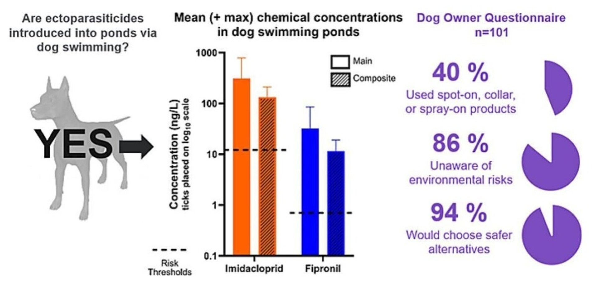 In all the other ponds, no imidacloprid or fipronil were detected. Some contamination was detected in connecting streams, and further water analysis showed this was not associated with other signatures of urban wastewater, suggesting dogs were the only source.