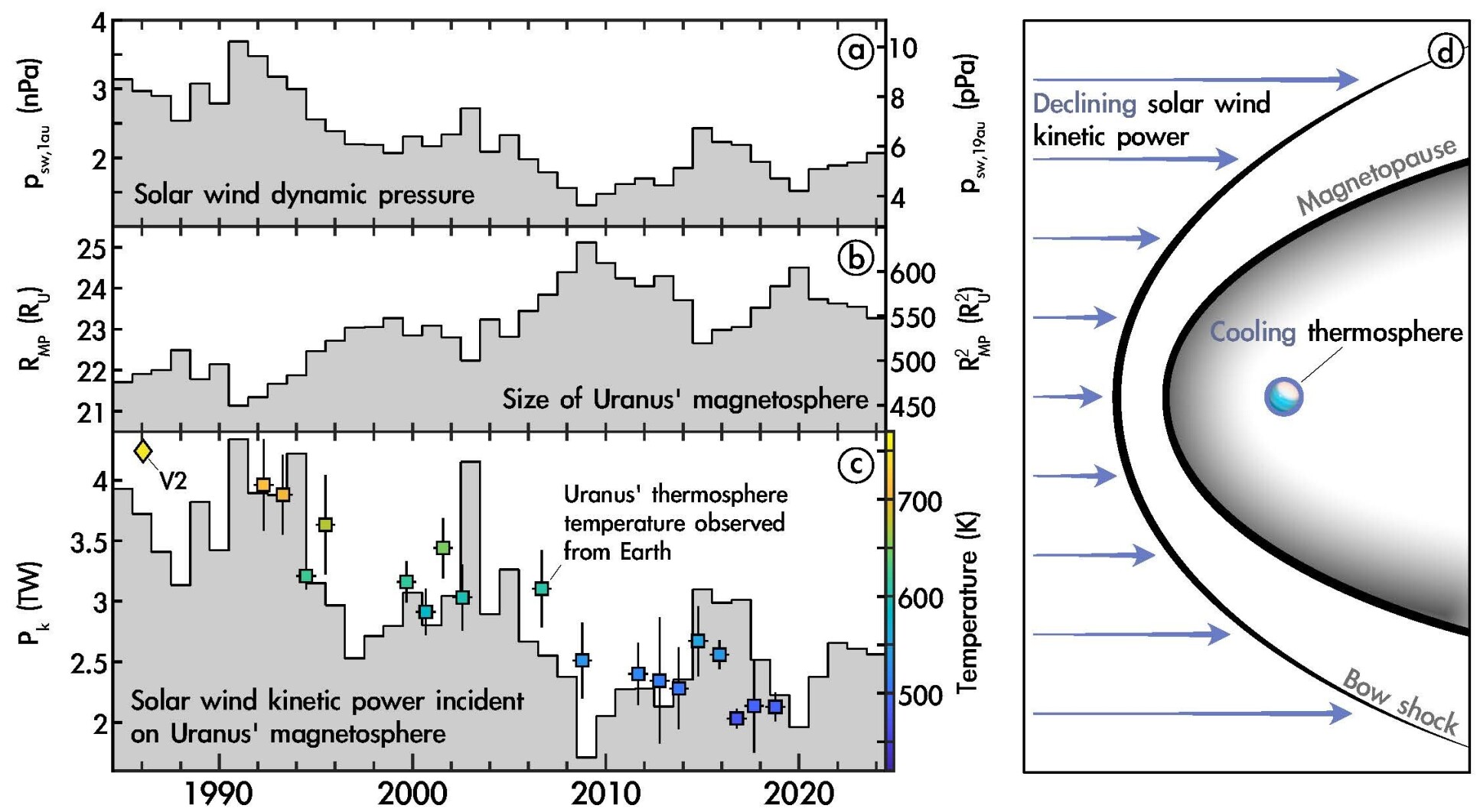 However, the solar wind flowing away from the Sun into space has also been changing in a different way, over a longer time scale. The annual average outward pressure of the solar wind has been slowly but significantly dropping since around 1990, while showing little correlation to the 11-year cycle. This decline however closely mirrors Uranus’ thermosphere temperature decline.