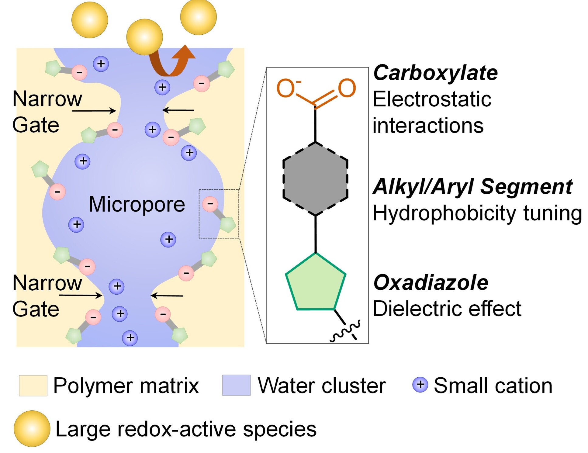 “By adding hydrophobic pendant groups to the PIM polymer backbone, such as oxadiazole and benzene rings, we are able to tune the local hydrophobicity and hence tailor the pore size and ion transport when the membrane is in an aqueous solution,” he explained.