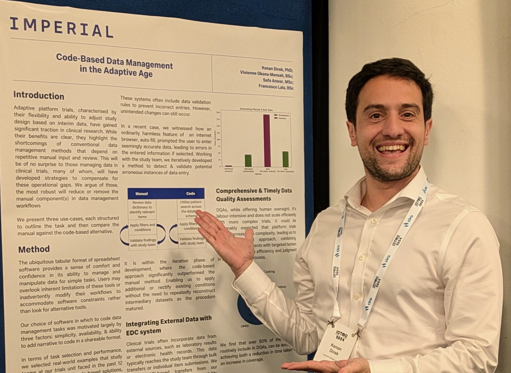 Kenan Direk displaying his poster on Code-Based data management in the adaptive age at the International Clinical Trials Methodology Conference