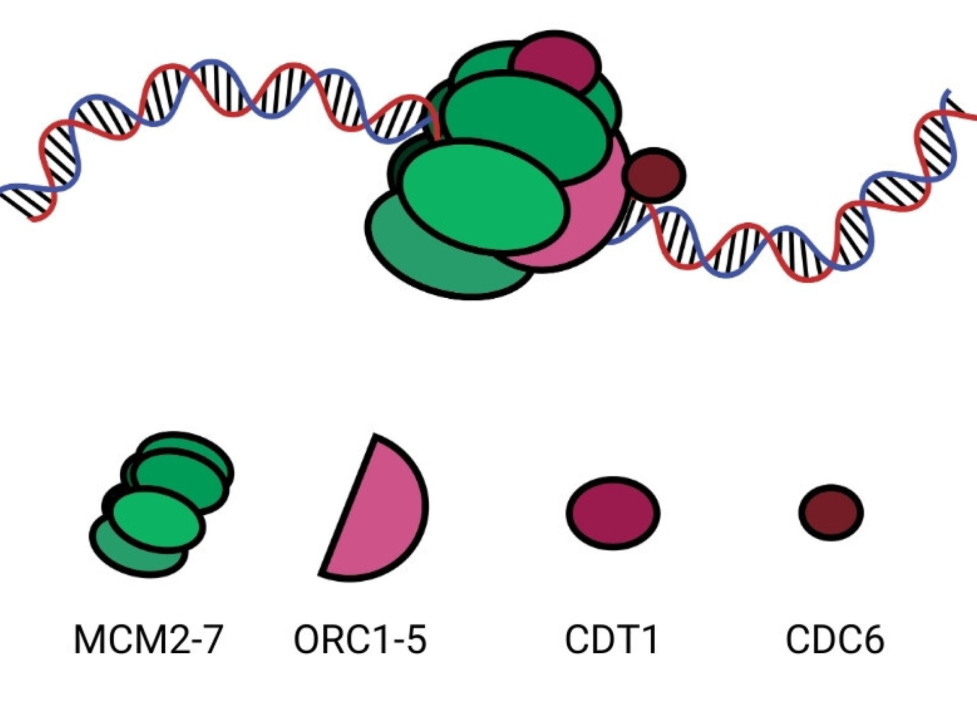 - The origin recognition complex (ORC1-6), which is made up of 6 subunits and binds to the DNA