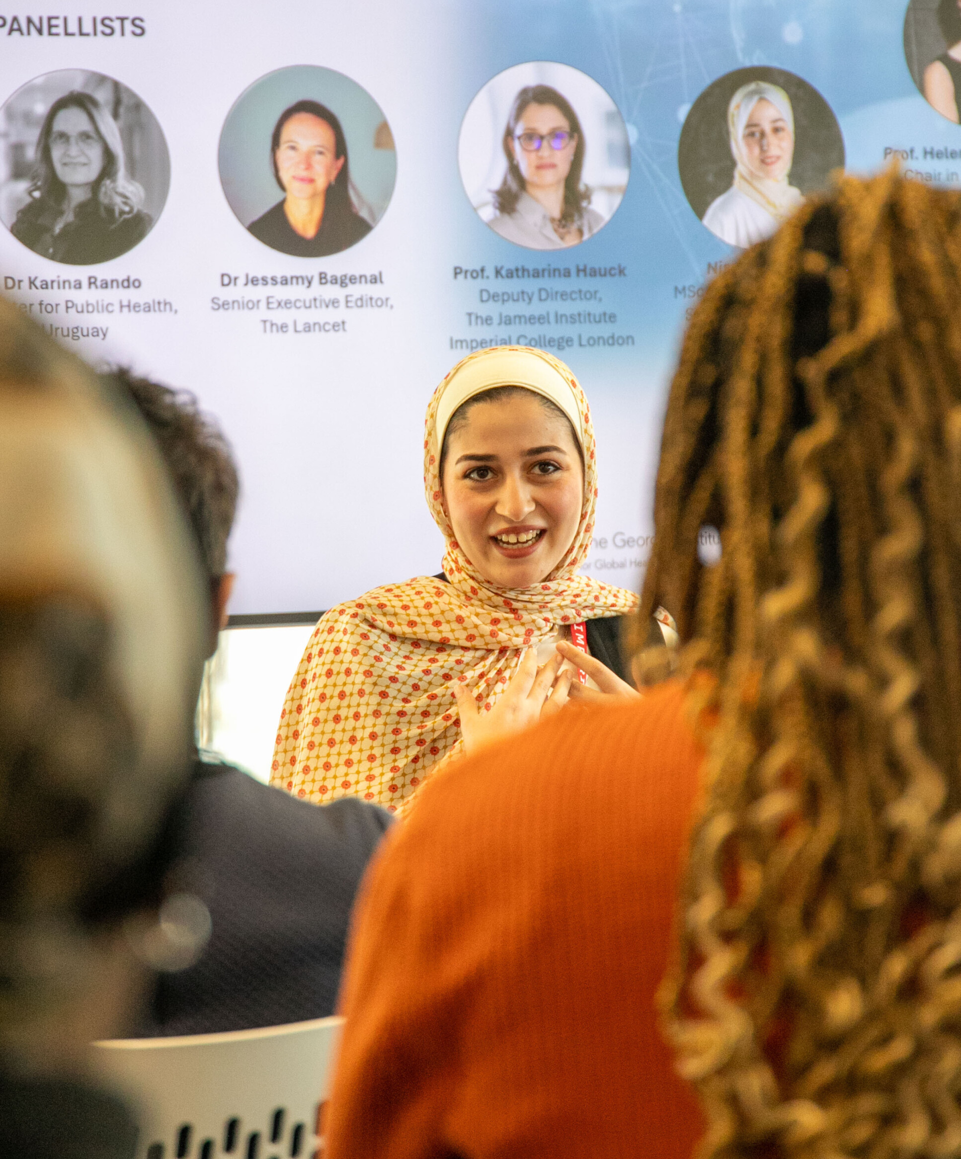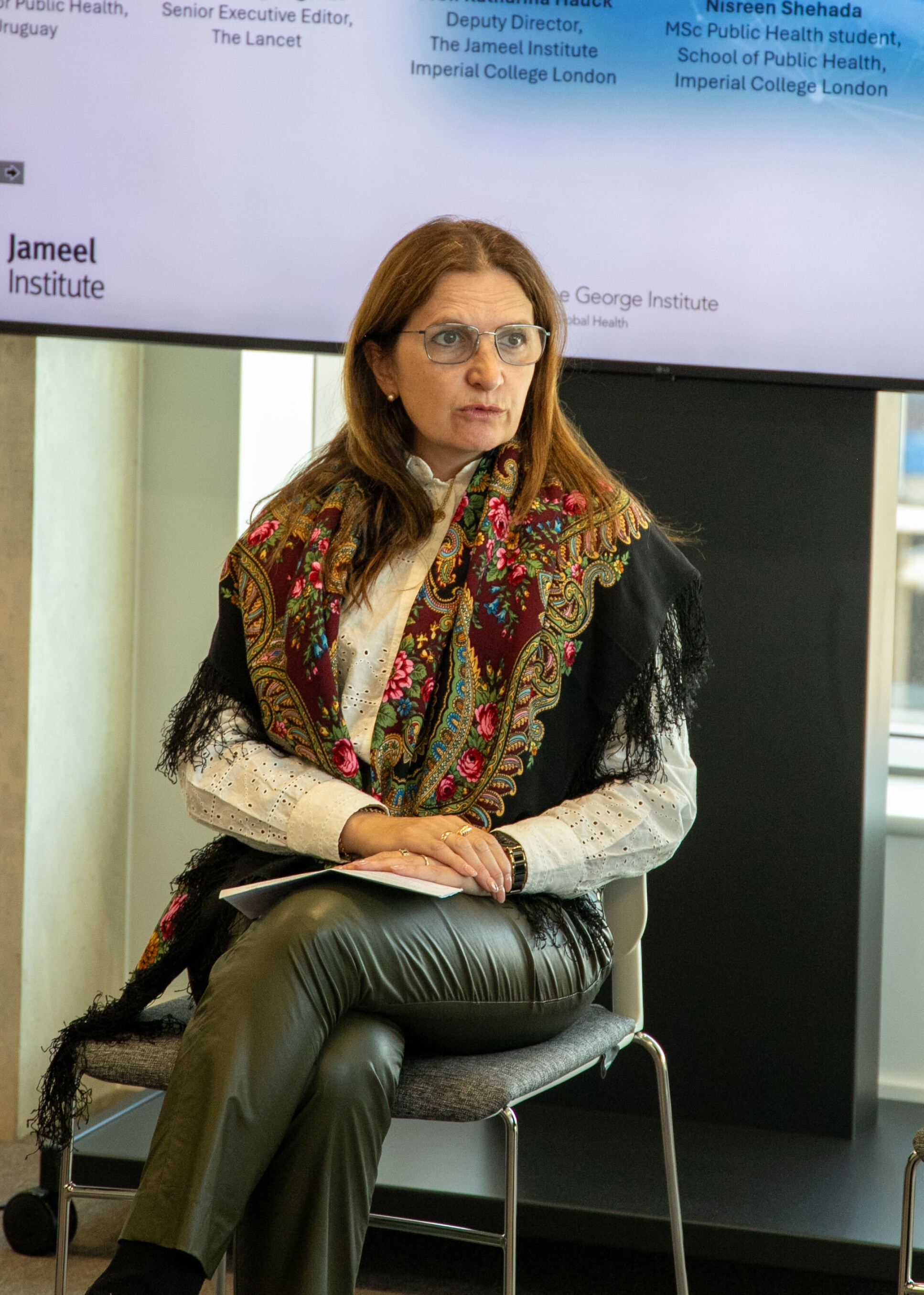 Speakers on the panel included Dr Karina Rando (Former Minister of Public Health, Uruguay), Professor Katharina Hauck, Deputy Director, the Jameel Institute & Professor of Health Economics, School of Public Health), Dr Jessamy Bagenal (Senior Executive Editor, The Lancet) and Nisreen Shehada (Master of Public Health candidate, School of Public Health).