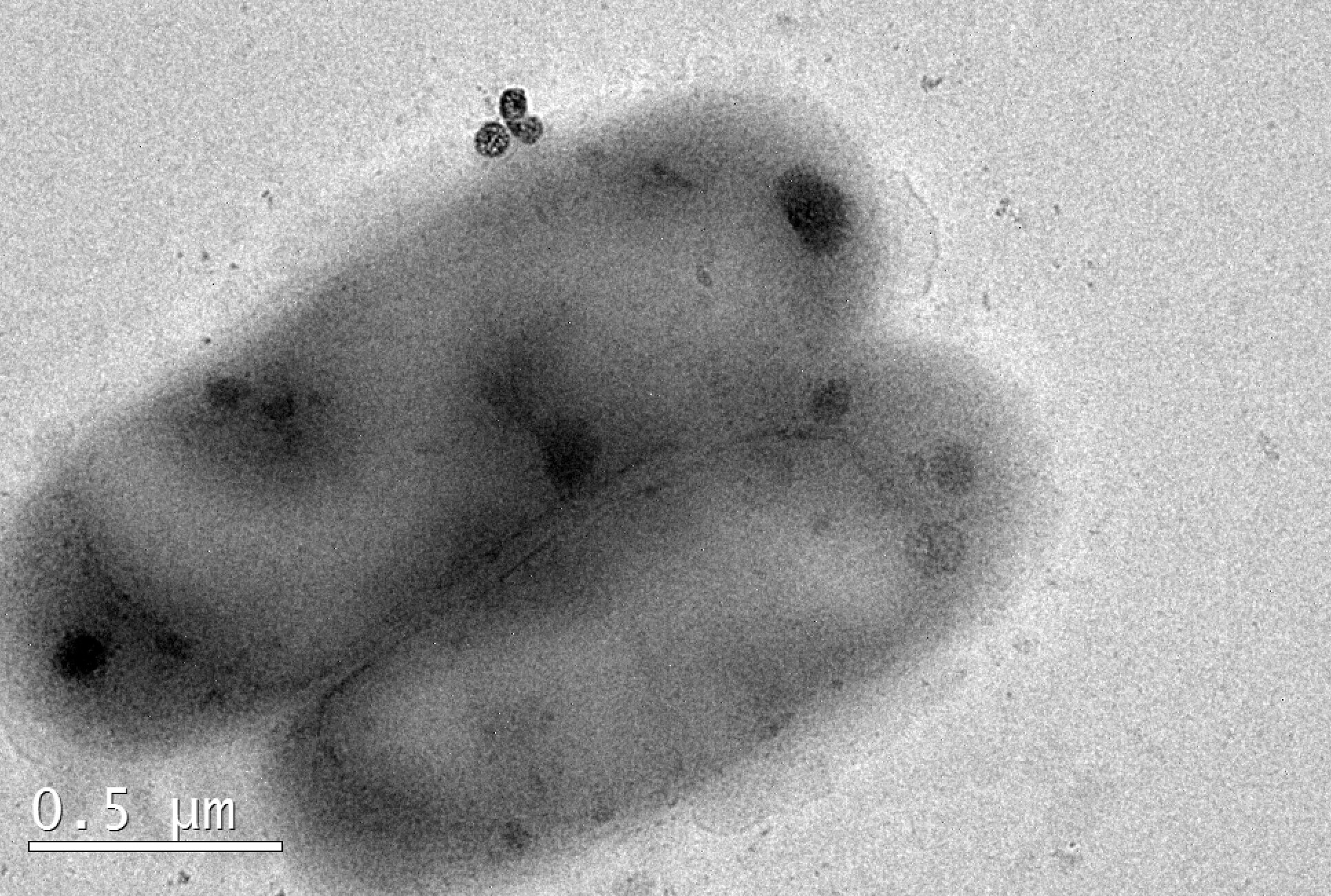 This image was captured during Zizheng's first attempt to prepare an 80-nm-thick section for TEM imaging. To their surprise, bacteria (lower right) and silica nanoparticles (upper left) appeared in the same field of view. It looked like a microscopic battlefield—an unexpected encounter between biology and nanomaterials.