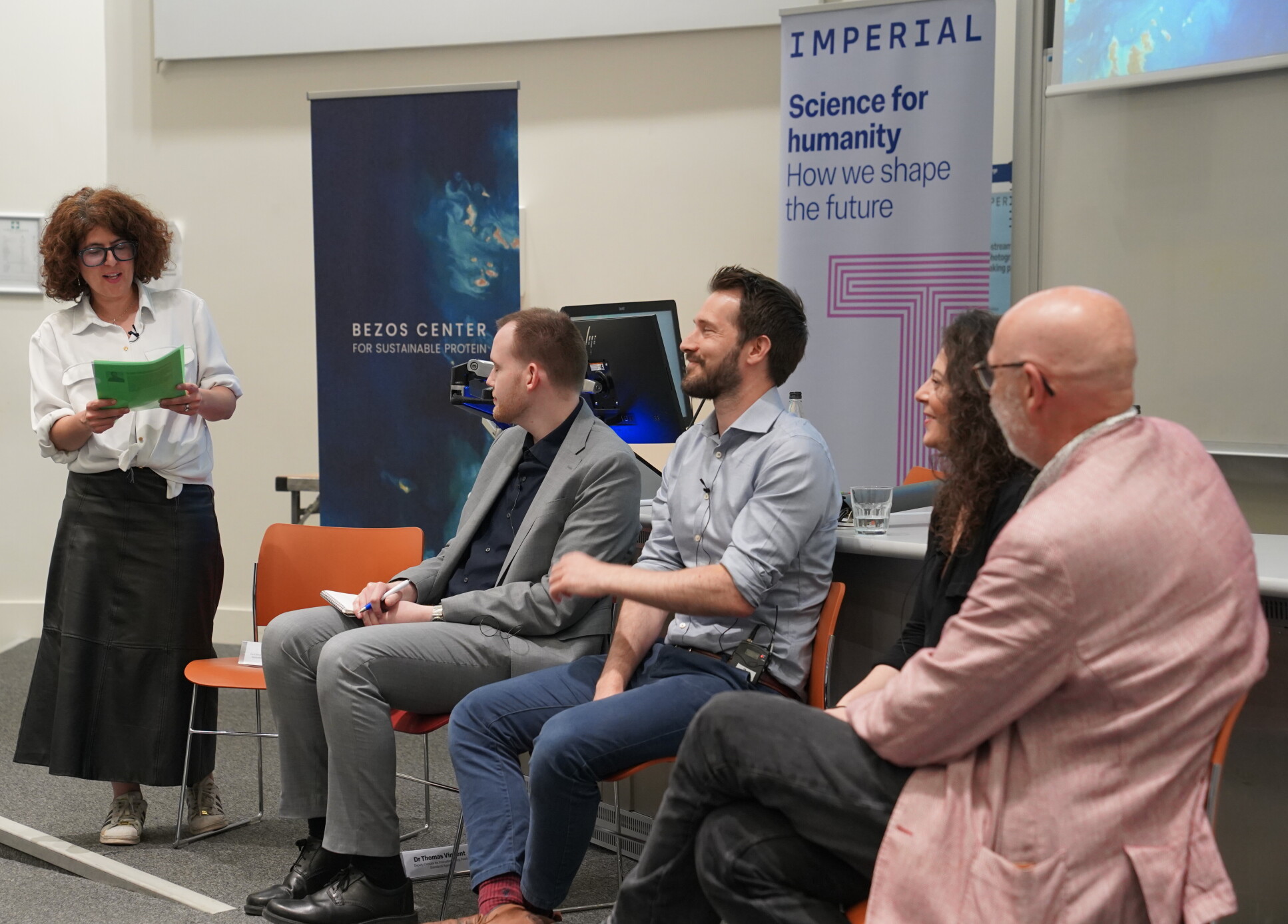 Published on May 2025, this briefing paper was launched at an event open to the public which began with an exhibition featuring presentations from researchers at Imperial and startups in the sector. The paper was presented by lead author Dr Rodrigo Ledesma-Amaro, Director of the Bezos Centre for Sustainable Protein, followed by a panel discussion and a Q&A from the audience. Chaired by Alyssa Gilbert, Co-director of the School of Sustainability and Director of Innovation at the Grantham Institute and Undaunted, the panel also included Dr Thomas Vincent (Deputy Director for Innovation Policy, FSA), Dr Richard Smith (Head of Synthetic Biology at Better Dairy), Dr Afroditi Chatzifragkou (Associate Professor in Sustainable Bioprocessing, University of Reading), and Professor Gary Frost (Chair in Nutrition & Dietetics, Imperial).
