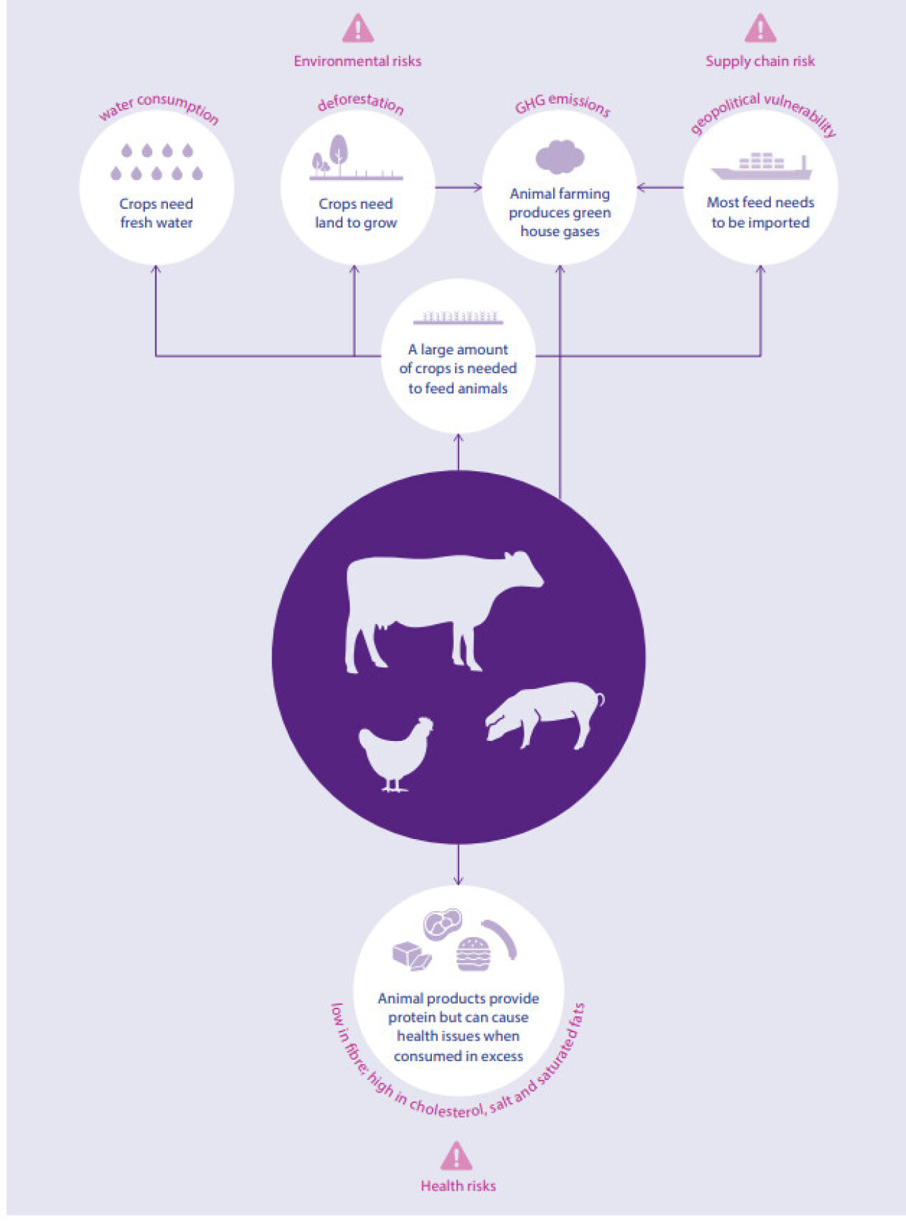 In the sustainability front, industrial agriculture currently contributes to 11% of UK carbon emissions while also requiring large volumes of water and land causing environmental harm. In terms of health, meat products are high in protein but also high in saturated fat and cholesterol. Our current diets contribute to obesity and health inequalities. Additionally, as a country reliant on imports for the food industry, the UK is vulnerable to supply issues because of climate change and geopolitical tensions.