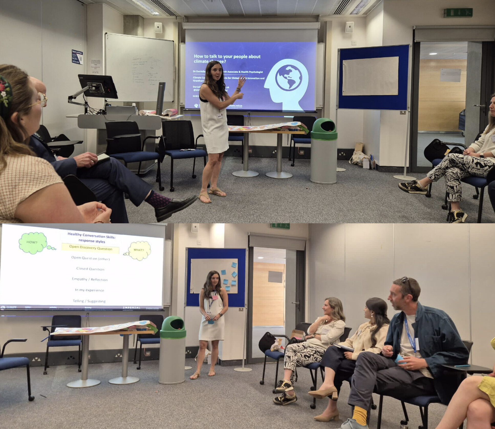 Finally, the session “How to Talk to People About Climate Change”, facilitated by Dr Daniella Watson from the Climate Cares Centre, highlighted the importance of using open discovery questions (“how” and “what”), understanding different responses, and improving communication skills, especially for climate change conversations. Those who attended the session also valued the opportunity to network, share practical skills, and achieve greater emotional understanding.
