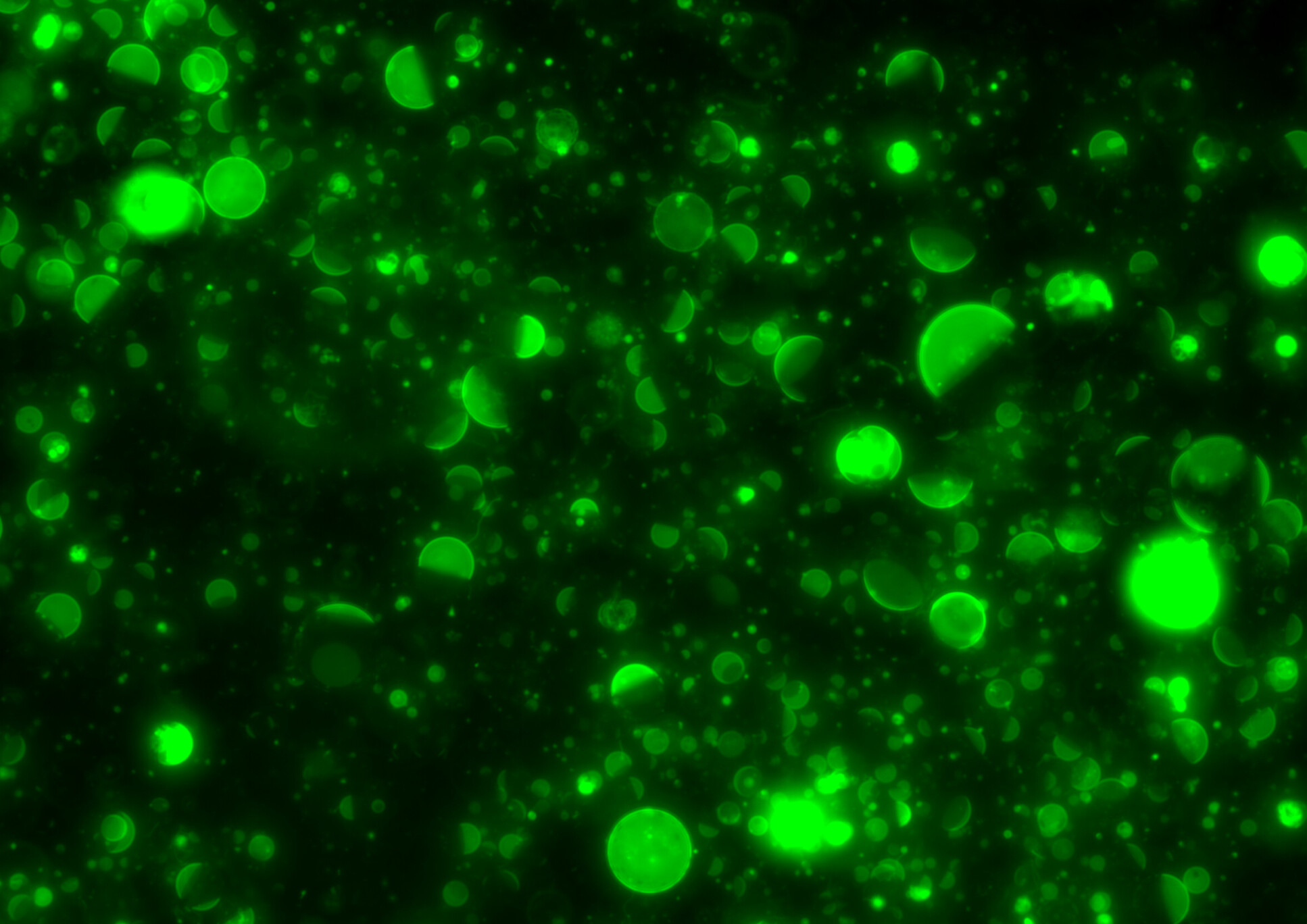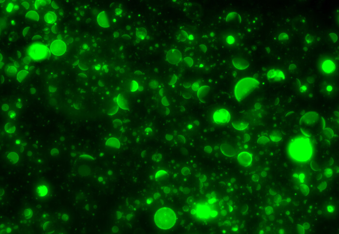 "Here is a collection of cell-sized microbots that contain a fluorescent probe inserted in their membranes. We call these microbots "synthetic cells" as they are made of lipid (oil) molecules assembled into a membrane, similar to a biological cell. Depending on the type and shape of the lipids, the synthetic cells show a variety of membrane patterns, resembling different phases of the moon. The fluorescent lipid (green colour) acts as an indicator of how well-mixed the membrane is, with some membranes being fully mixed and others separated into two or more regions. This is useful for engineering different functions at specific locations across the membrane."