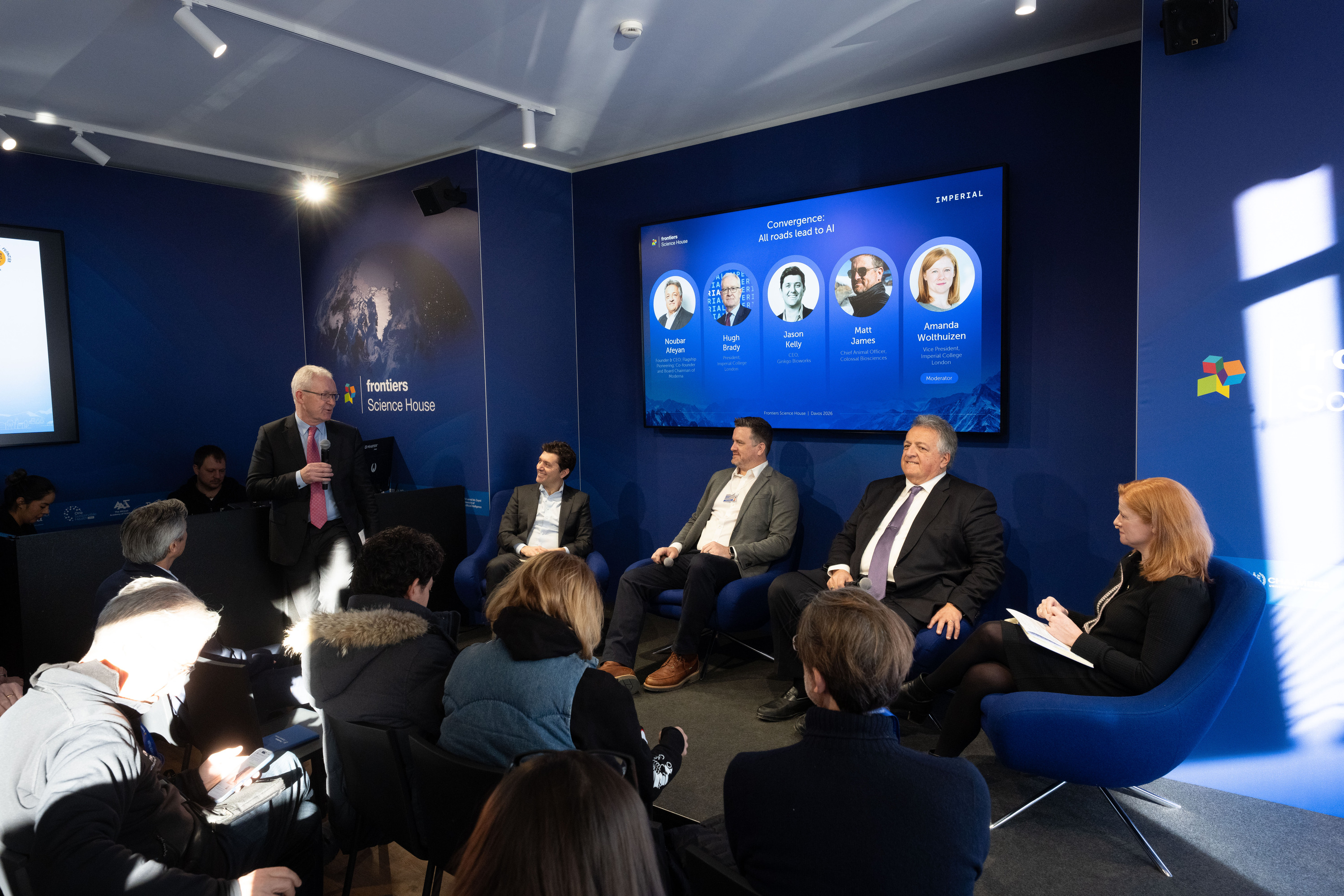 Imperial headlined the Frontiers Science House programme with a plenary event - Convergence: All Roads Lead to AI - bringing together pioneering biotech company leaders working across synthetic biology, lab automation, and emerging technologies to explore the transformative potential of AI-driven scientific innovation. Following welcome remarks by Imperial's President, Professor Hugh Brady, Amanda Wolthuizen, Imperial's Vice-President Strategic Engagement, chaired a panel featuring Noubar Afeyan, CEO & Founder of Flagship Pioneering, Jason Kelly, CEO & Co-founder of Ginkgo Bioworks, and Matt James, Executive Director of Colossal Foundation.