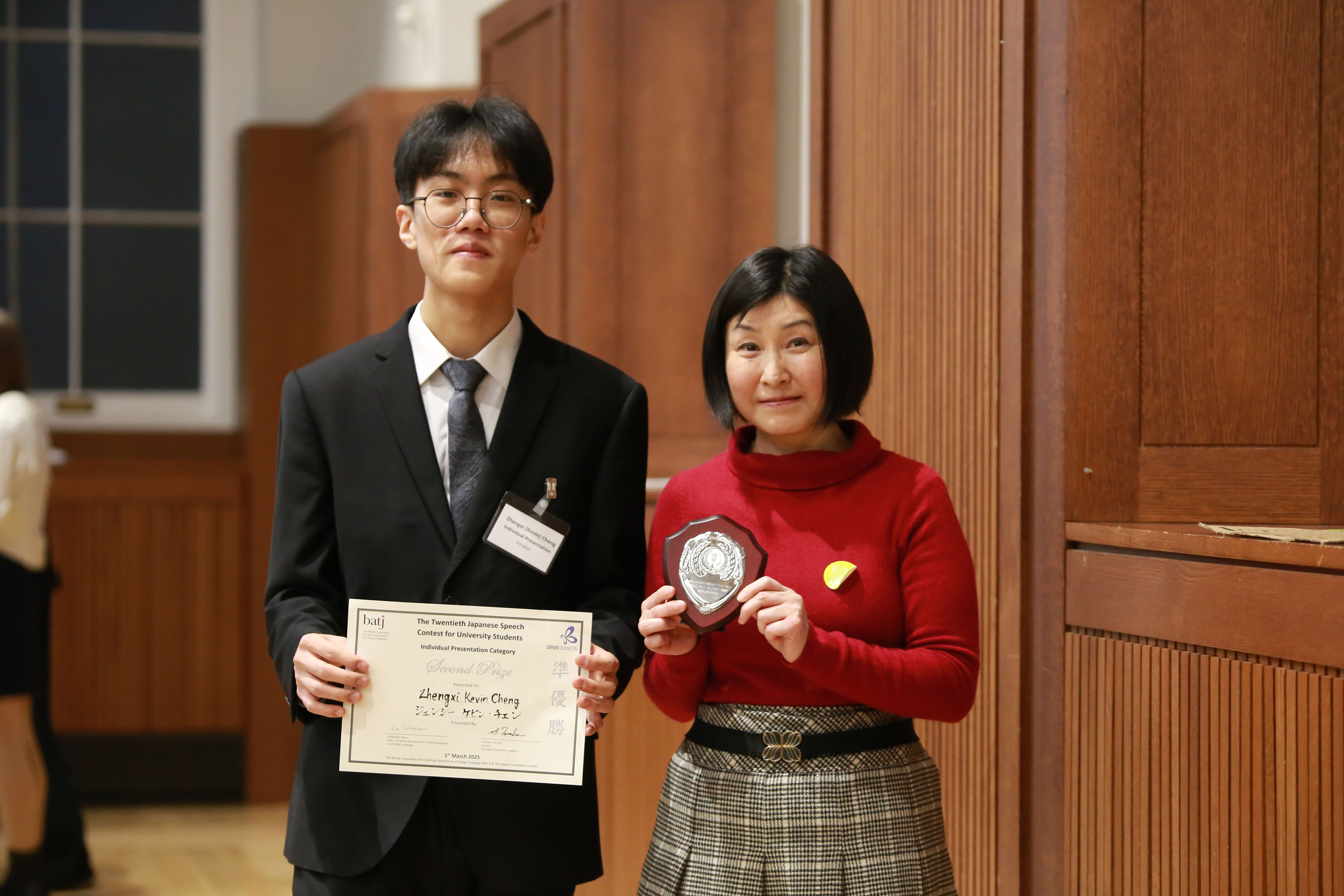 Kevin Cheng (Japanese Level 4, 3rd Year Chemical Engineering) gave a presentation entitled 「AIとより良い社会」 (AI and a Better Society) and explored the impact of artificial intelligence (AI) on modern society, highlighting both its benefits and potential risks. Kevin was awarded Second Prize in the Individual Presentation Category