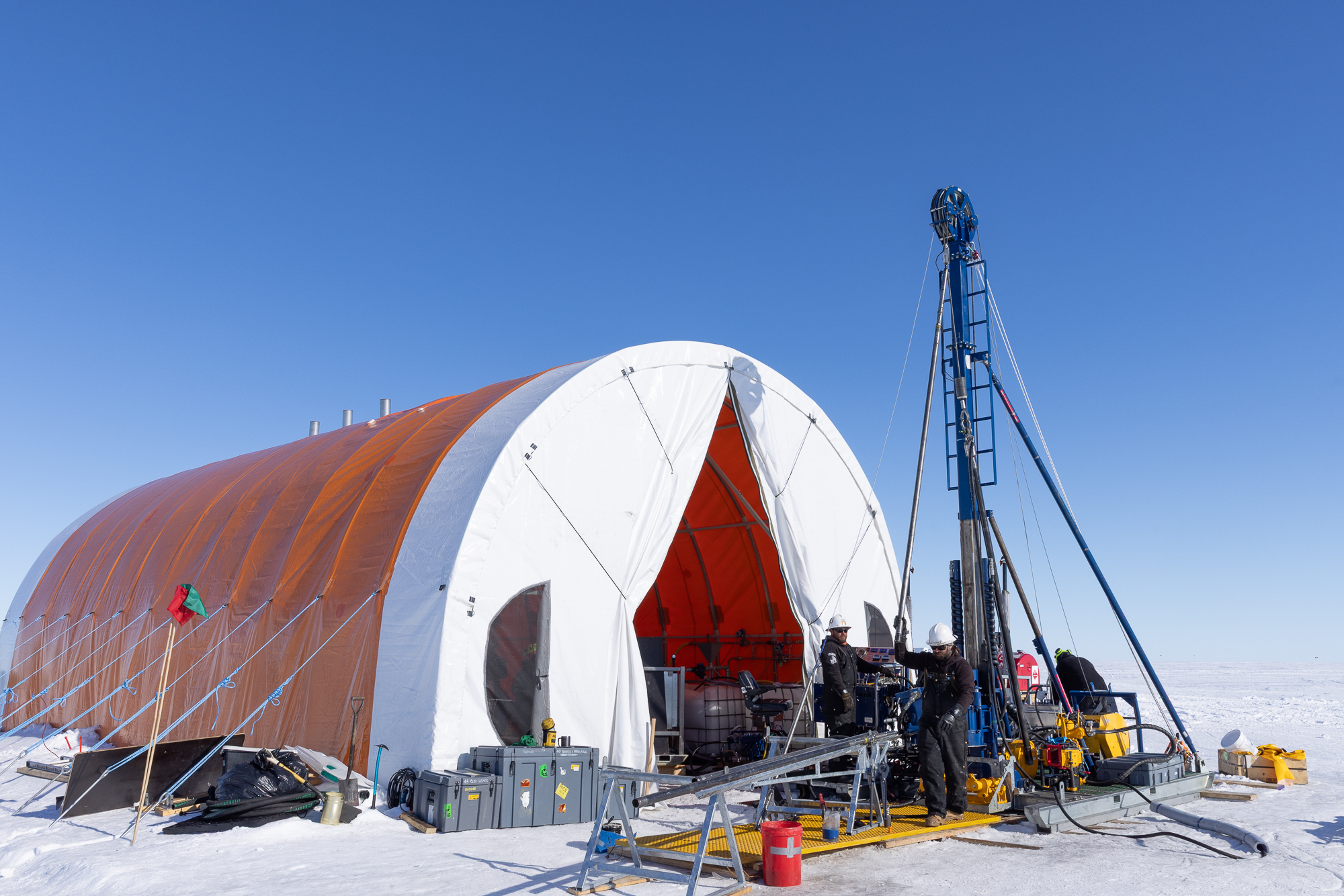 This groundbreaking work was supported by logistical contributions from two national Antarctic programs. Antarctica New Zealand provided the traverse capability to tow the custom-designed drilling system and field supplies 1100km across the Ross Ice Shelf. This team then established and operated the remote field camp through a nearly 10-week season. The National Science Foundation’s United States Antarctic Program also provided critical airlift and other logistical support. Weather presented a significant challenge, with the drillers’ and scientists’ flights into camp delayed by weeks due to freezing fog at the site.