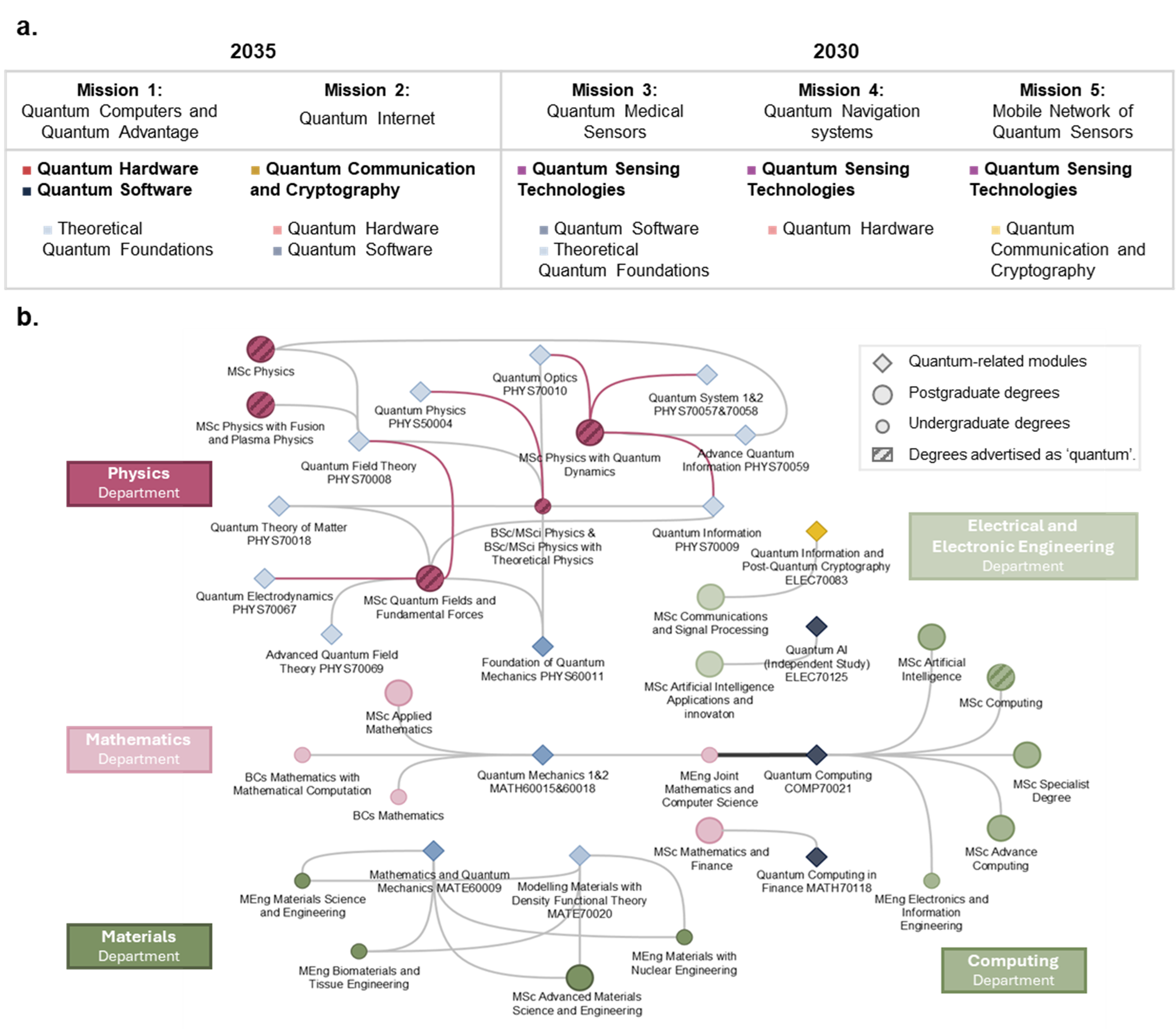 Fig1. a) Summary of national quantum missions and the main and secondary quantum skills they require. b) Network of quantum-related modules taught at Imperial and their links to undergraduate and postgraduate degrees. Modules colours correspond to the skill categories in panel a. Links are light grey for elective modules, coloured for core modules, and dark grey for modules shared between departments.