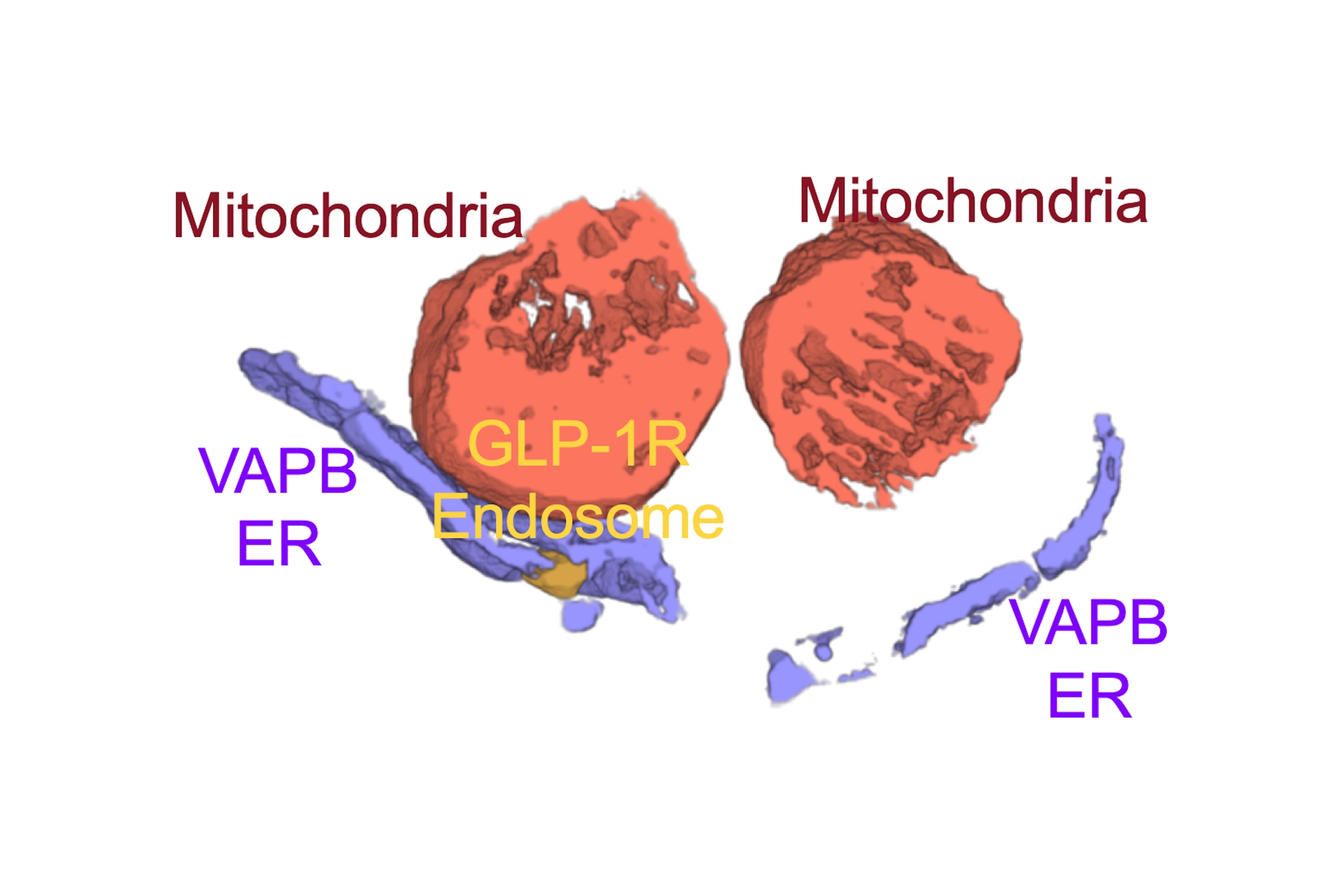 Once activated by GLP-1RAs, the GLP-1 receptor is known to move inside the cell via transport vesicles called "endosomes". The researchers found that those endosomes then hook at special locations of the endoplasmic reticulum (ER) called "membrane contact sites". These locations are important hubs where signals are exchanged, allowing the GLP-1R to send signals into mitochondria to boost their regeneration in partnership with the proteins VAPB and SPHKAP, helping β-cells survive cellular stress and continue to produce insulin effectively.