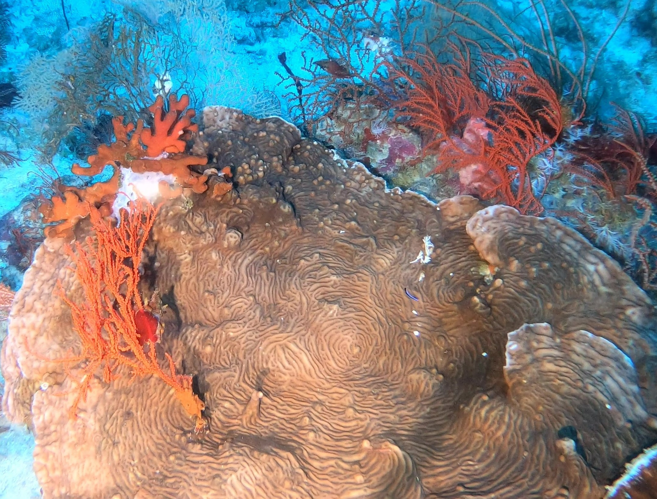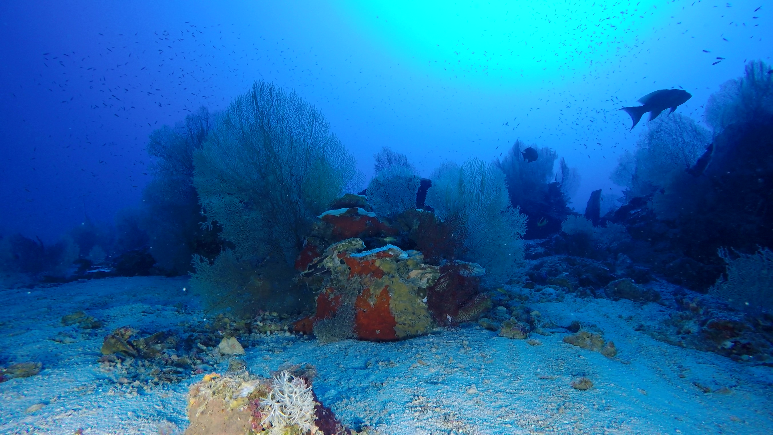 A mesophotic reef community composed of very large seafans and soft corals, some plate corals, sponges and a large abundance of reef fish in the background. Credit: University of Plymouth.