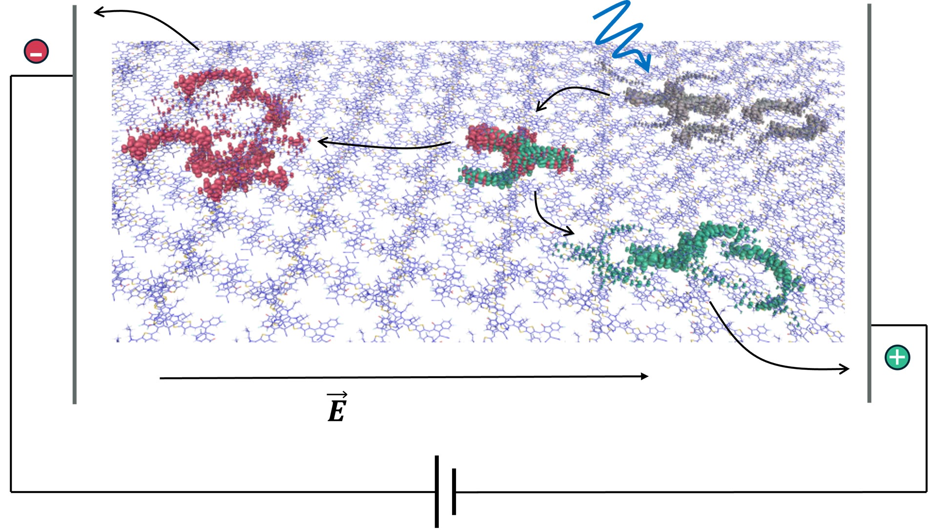 Visualisation of a photogenerated excited state (grey) evolving into separated positively (green) and negatively (red) charged regions of a molecular film. Credit: co-author Dr Daniel Medranda.