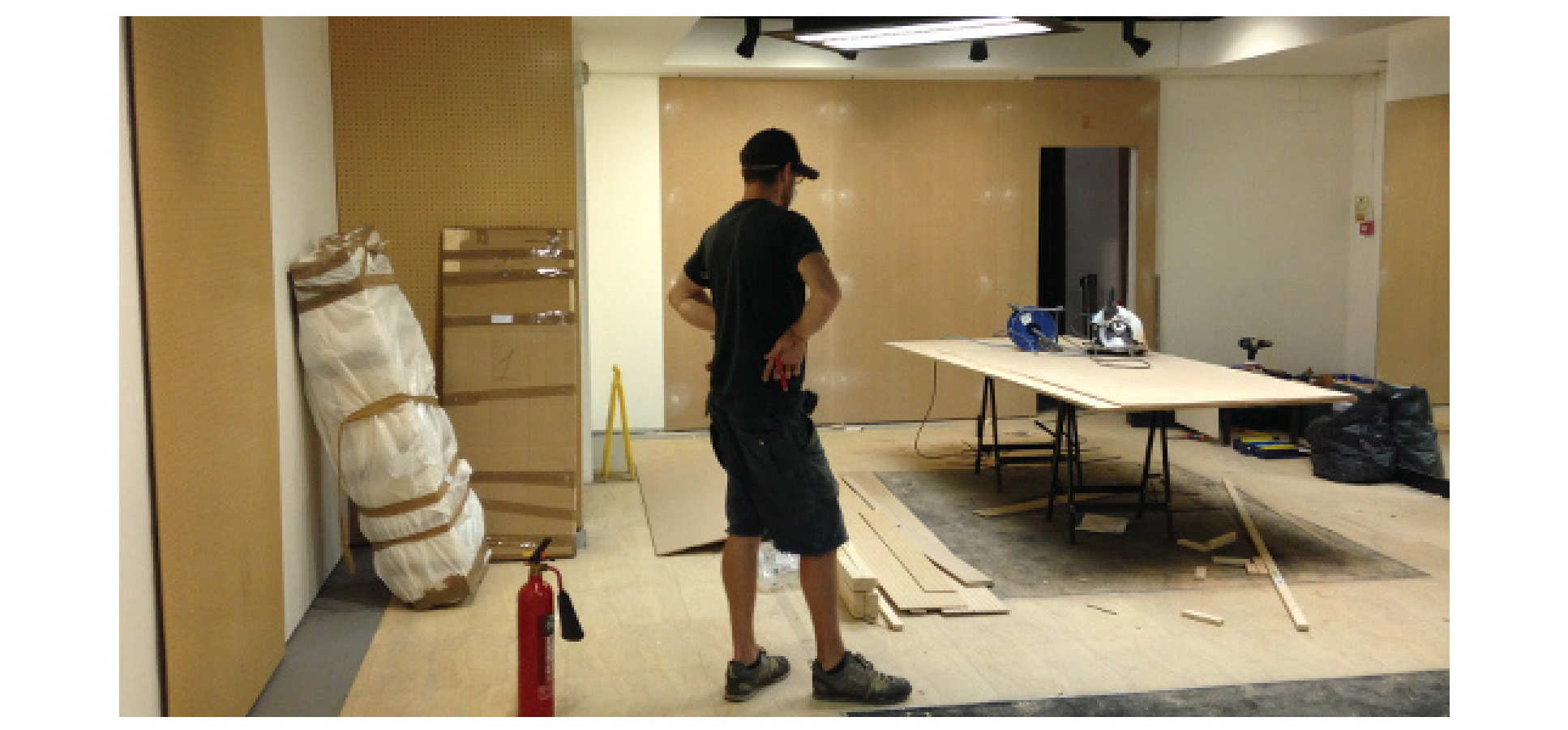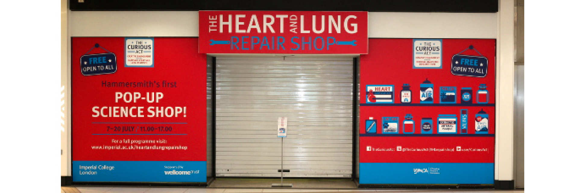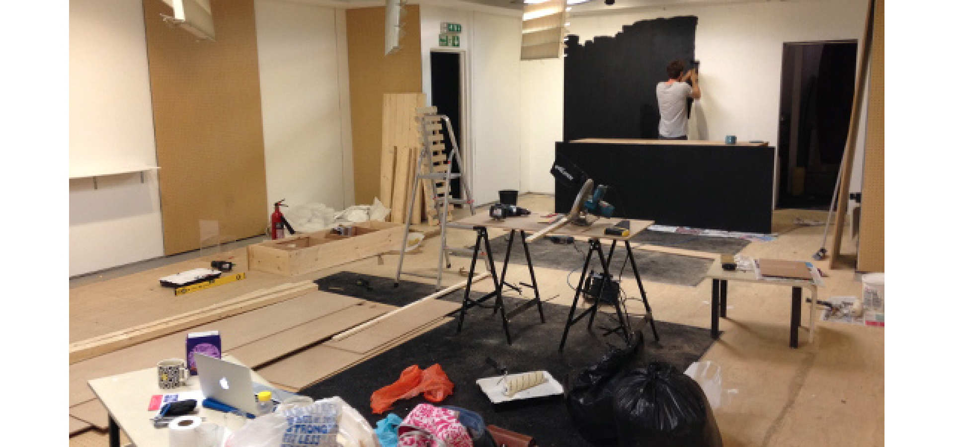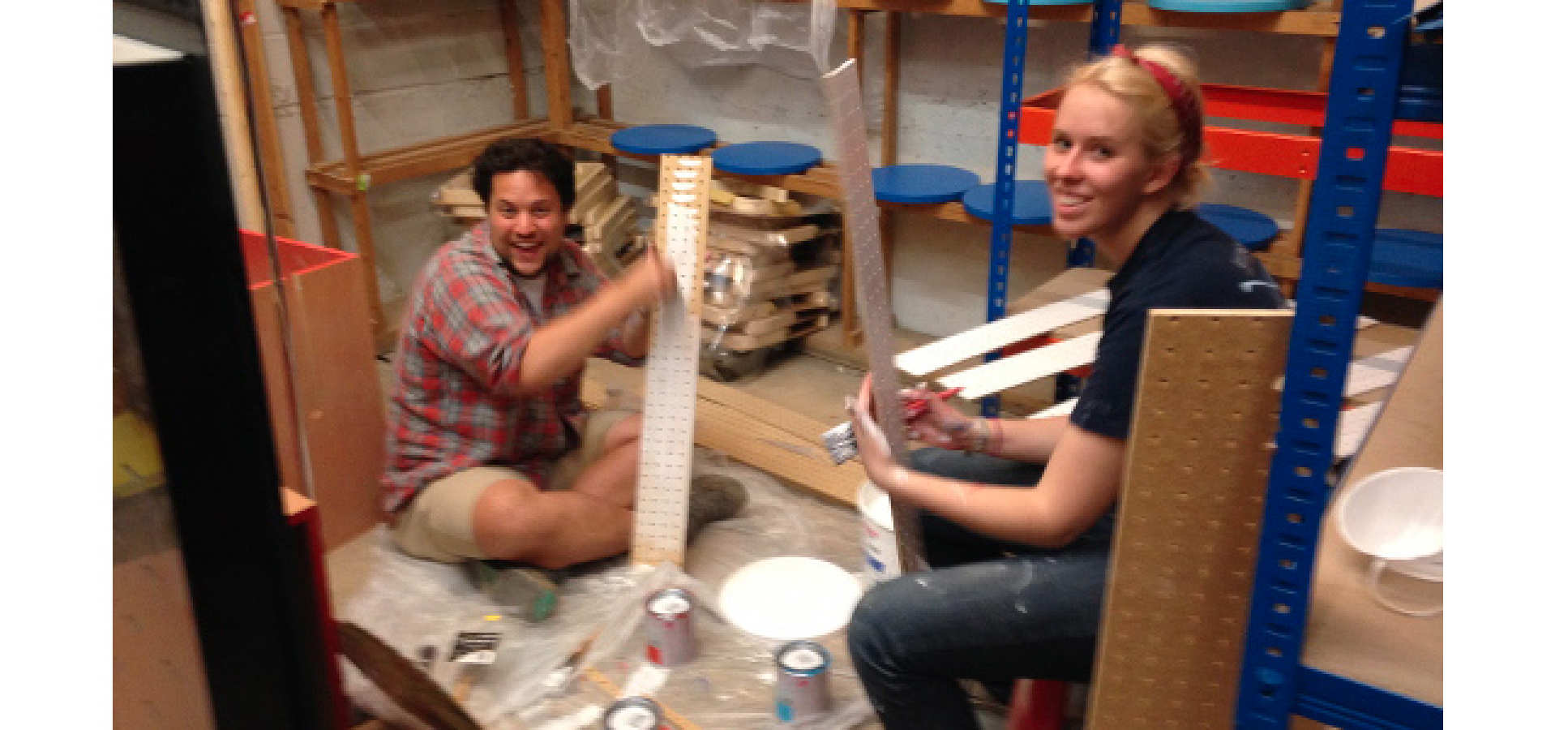 It took a lot of hard work to transform our retail unit into The Heart and Lung Repair Shop! Here are Chris, Will and Annie pulling staples out of the wall panels, after we pulled off all the green felt.