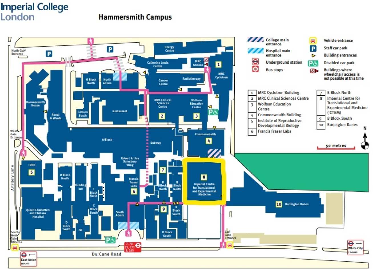 The NIHR ICRF is located on the ground floor of the Imperial Centre for Translational and Experimental Medicine (ICTEM), which please note is building 8 on the map below.