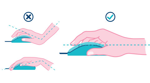 Keep the wrist straight to prevent aches and pains which can lead to repetitive strain issues. Ensure that the mouse is the right size for your hand. If you have very large hands, you may require a larger mouse to work more comfortably. It is important to type keeping your wrists straight.