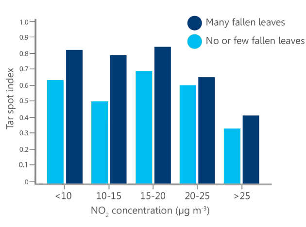 Gosling et al. (2016) examined the importance of different envrionmental factors on the extent of tar spot infection. For this, a ‘tar spot index’ was calculated for each Sycamore tree by dividing the number of tar spots counted by the total width of surveyed leaves. Their analysis shows that the tar spot index (i.e. the extent of tar spot infection) is lower at sites with no or few fallen leaves; and, above nitrogen dioxide (NO2) concentrations of around 20 μg m-3, the tar spot index starts to fall substantially (see Figure 3, left). This suggests that both hypotheses are potentially correct: that leaf litter acts as a source of tar spot fungus and, above a threshold concentration, NO2 air pollution limits tar spot growth (Gosling et al., 2016).