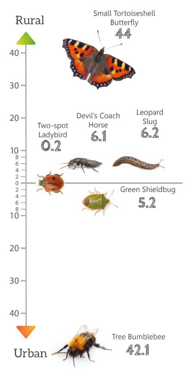 • A statistical analysis (Chi-squared test) of ‘Species Quest’ data showed species-specific relationships with urbanisation. Of particular note, the Small Tortoiseshell Butterfly (Aglais urticae) was strongly associated with rural study sites, whereas the Tree Bumblebee (Bombus hypnorum) was strongly associated with urban envrionments (Figure 1, left).