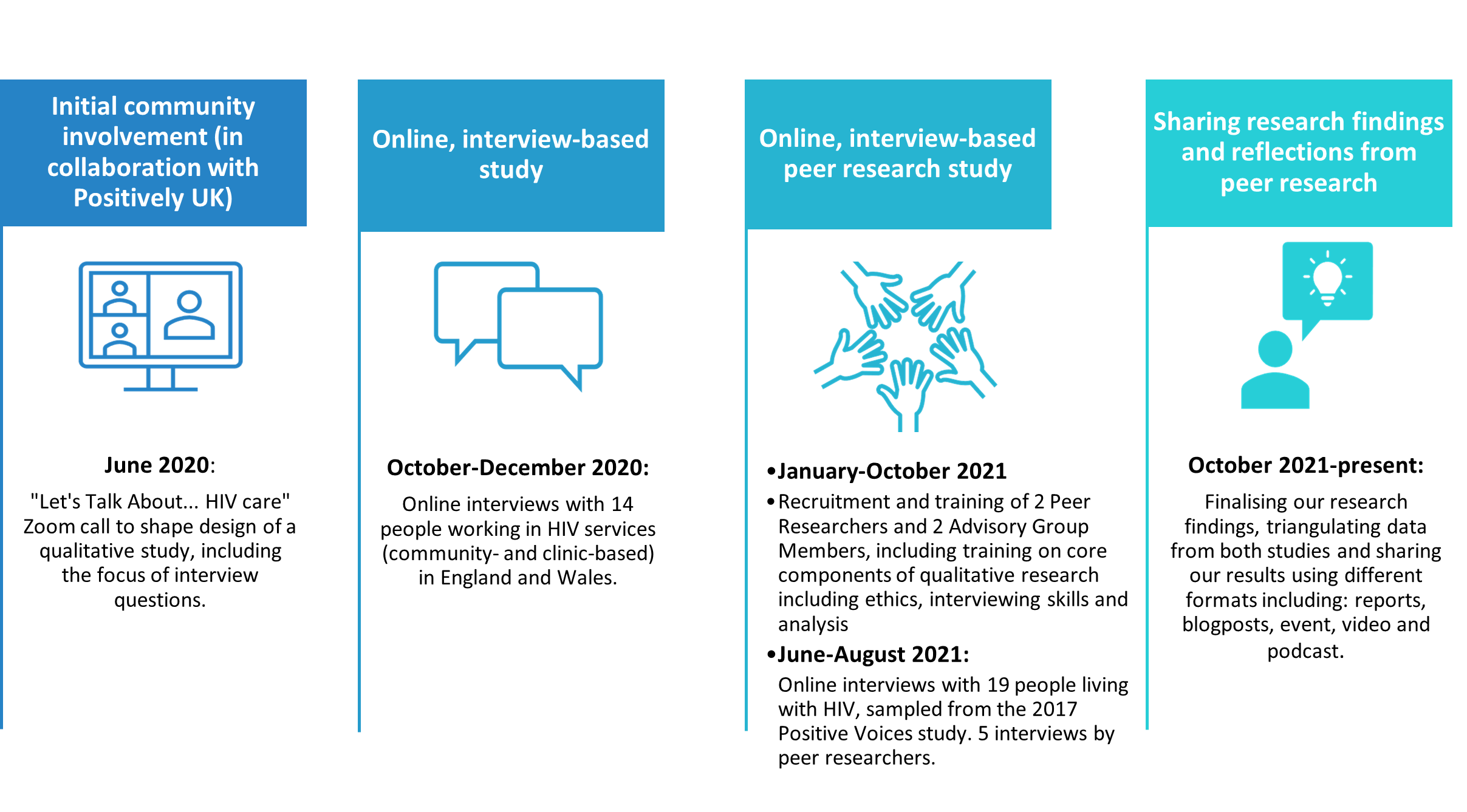 We aim to explore COVID-19 experiences among people living with HIV as well as HIV clinical- and community-based workers and volunteers. This work has been in collaboration with Positively UK[1]