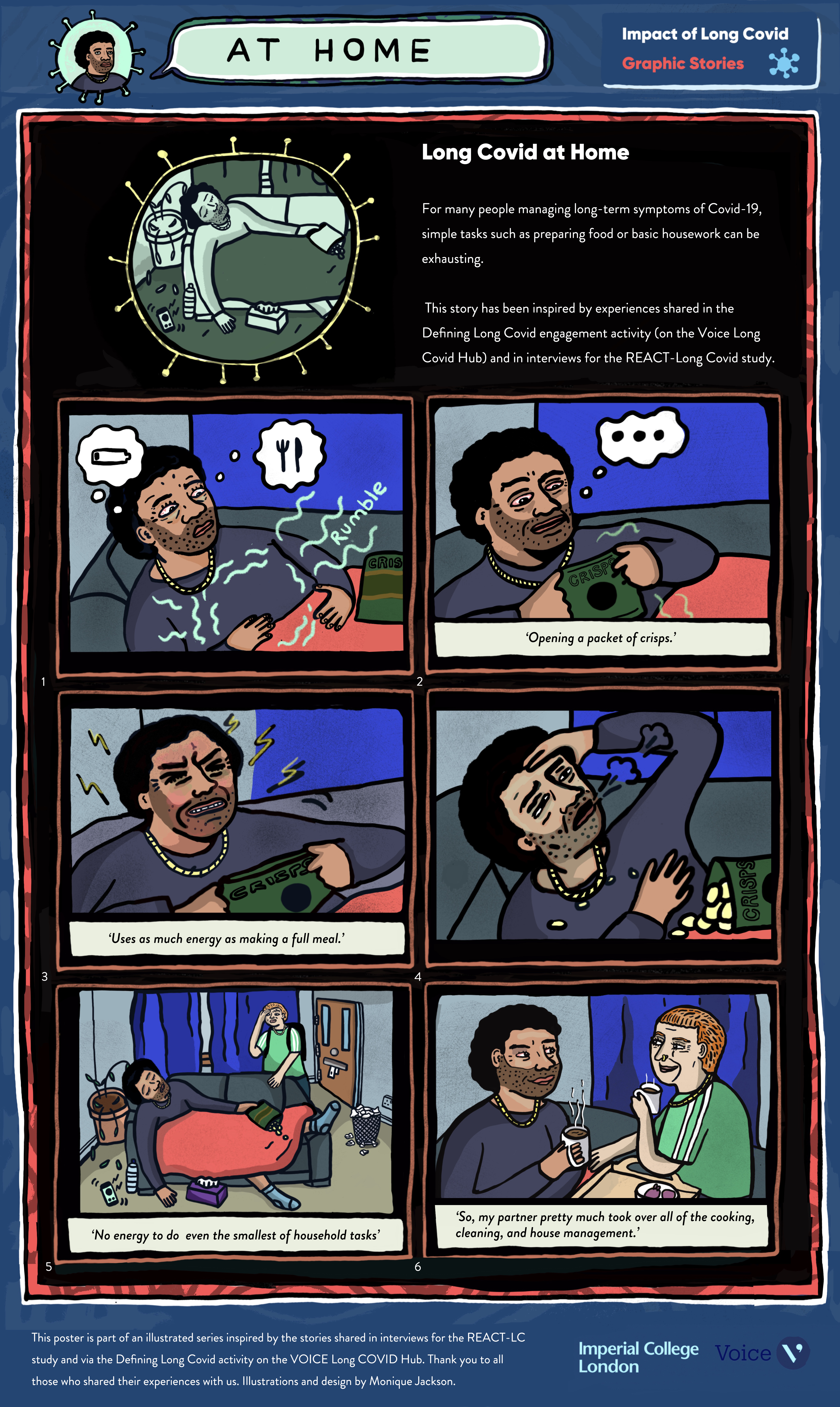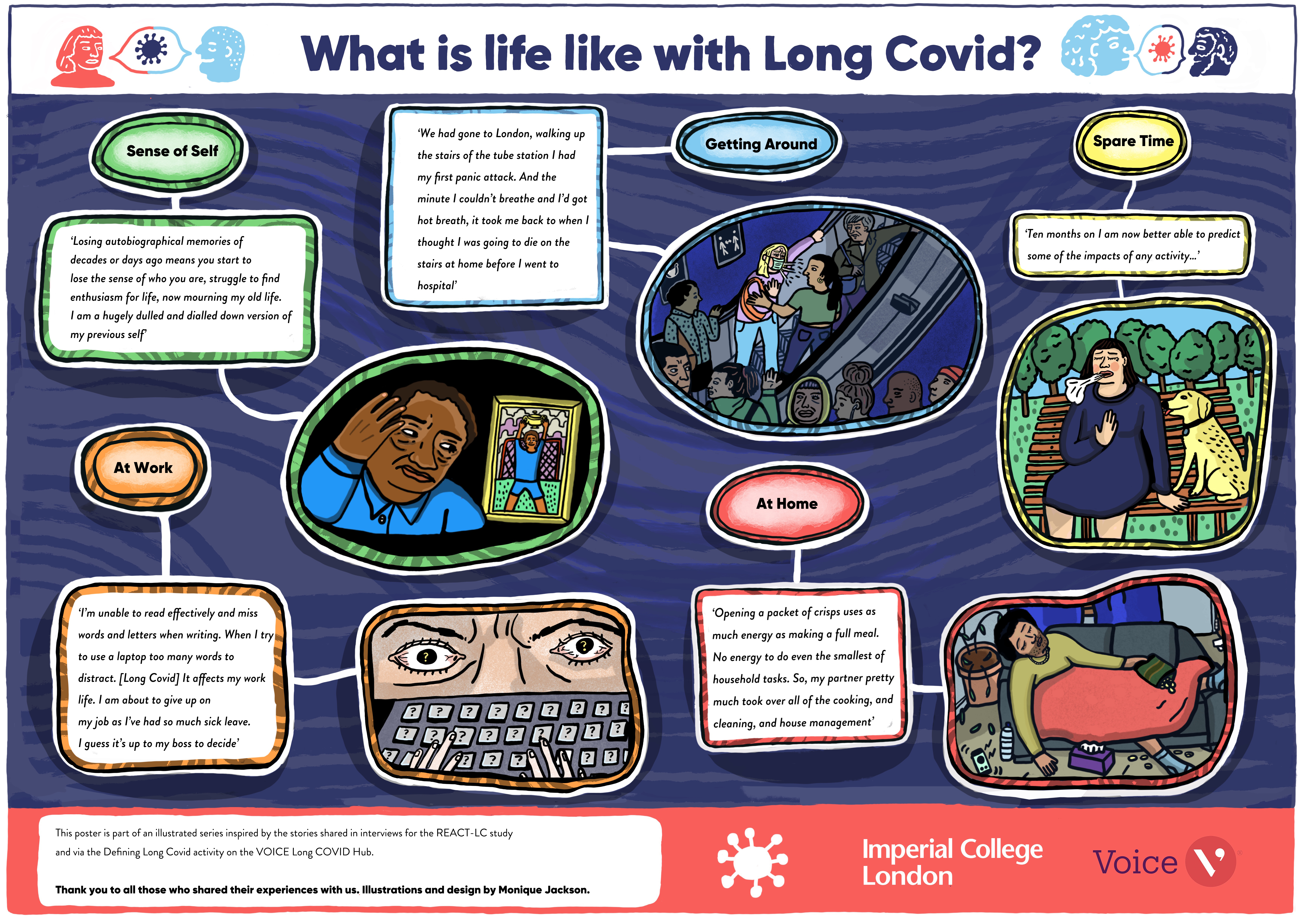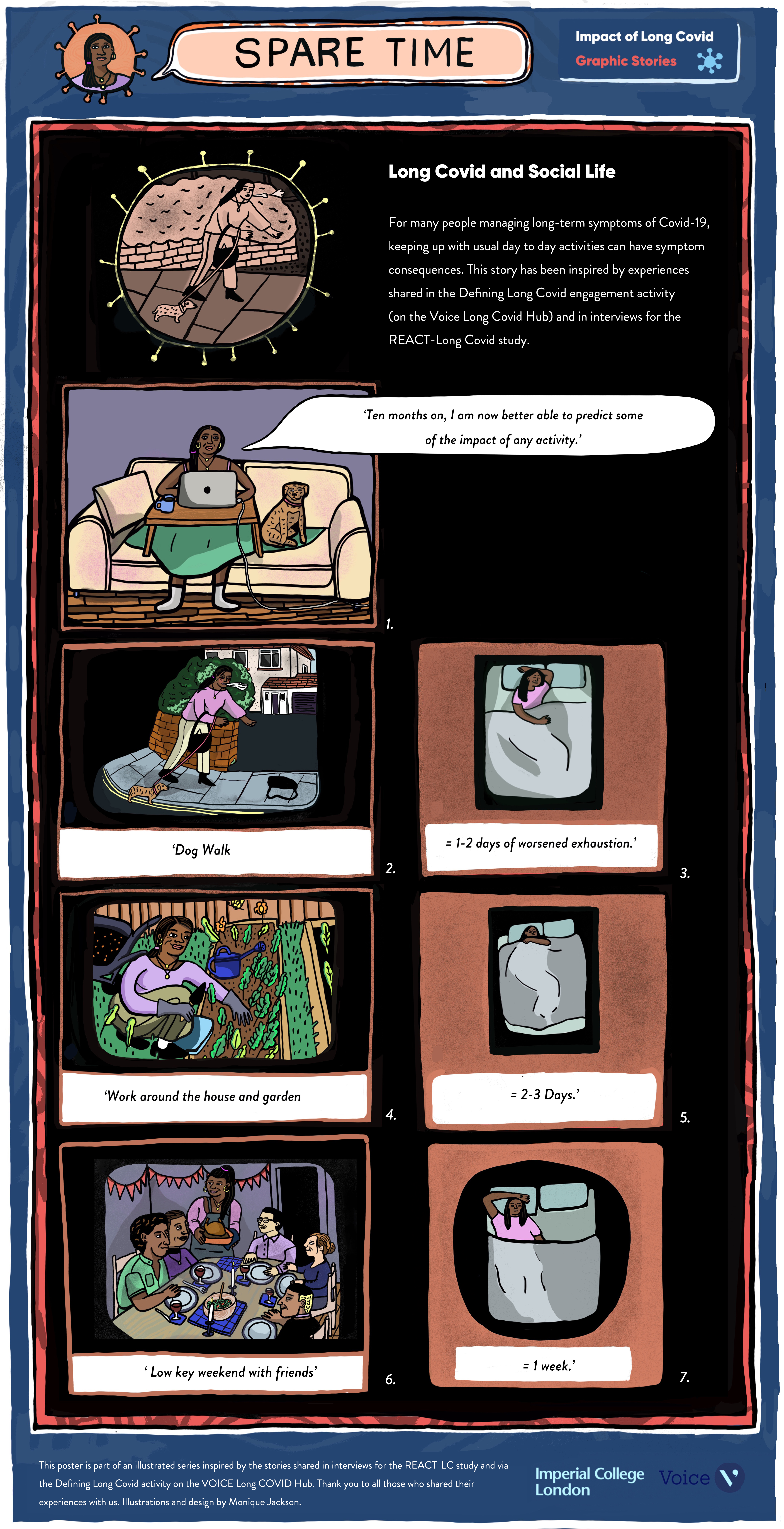 More recently Monique has developed a poster on the impacts of Long Covid to answer the question ‘What is life like with Long Covid?’. The poster is linked to a series of illustrated stories shared on our social media pages. These stories were inspired by the defining Long Covid responses as well as the REACT-LC study interviews and cover the different areas of people’s life that might be impacted by their symptoms. They can be viewed here.