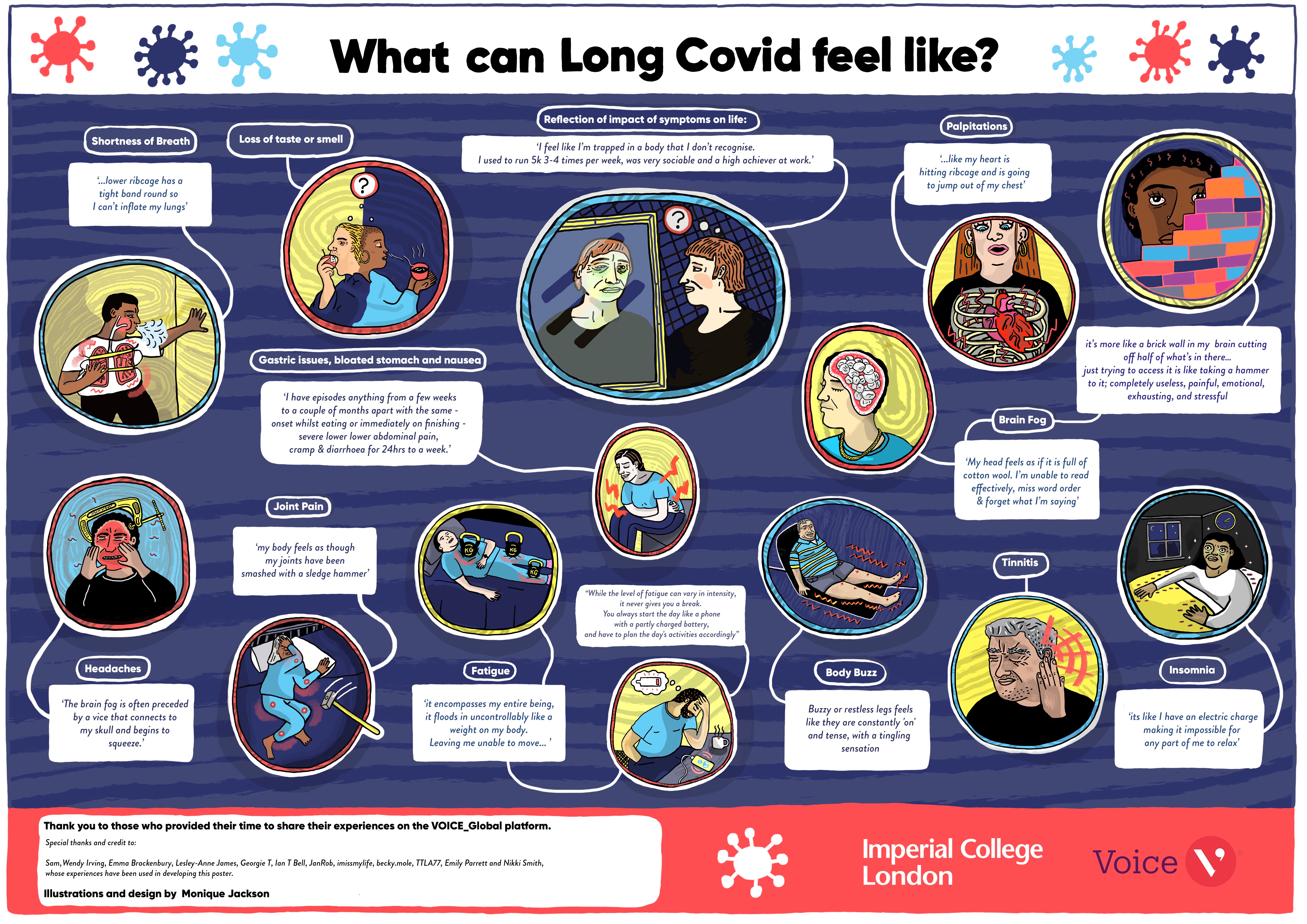 We received over 100 responses which capture the depth and breadth of symptoms experienced. One of our aims of this challenge was to use these responses to raise awareness of the symptoms of Long COVID, and their impact, in a way that is accessible, engaging, and impactful. As such, we have been working closely with our public advisor and illustrator Monique Jackson to develop illustrations which visually capture the range and impact of Long COVID symptoms.