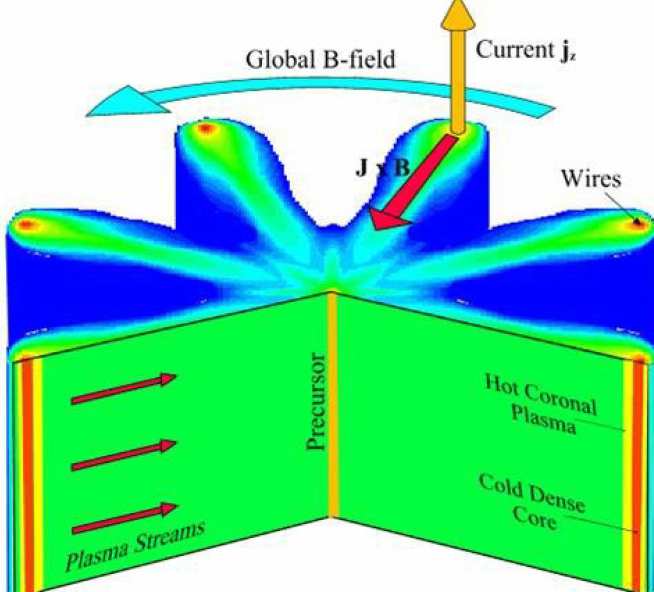 Wire array Z-pinches are the worlds’ most powerful X-ray sources. When a cylindrical array of thin wires is subjected to a large, fast rising current, the wires heat up and become plasma, the magnetic field created then pulls the plasma to the common axis, with implosion velocities of several hundred kilometers per second.