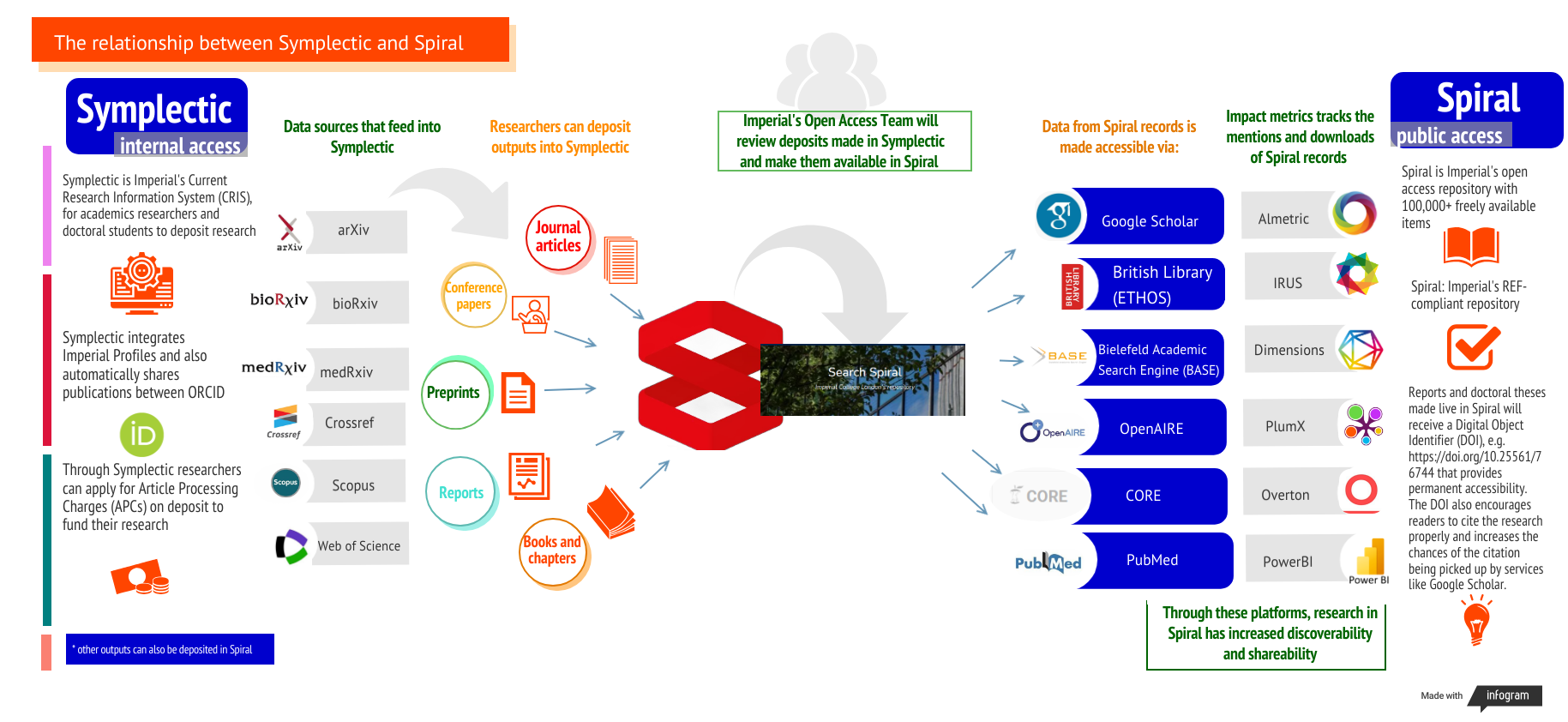 Imperial researchers depositing their work in Spiral will use Symplectic. The Library Services Open Access team will process their manuscript before it is made live in Spiral. Researchers who wish to publish gold open access and pay for Article Processing Charges (APC) can also do this through Symplectic.